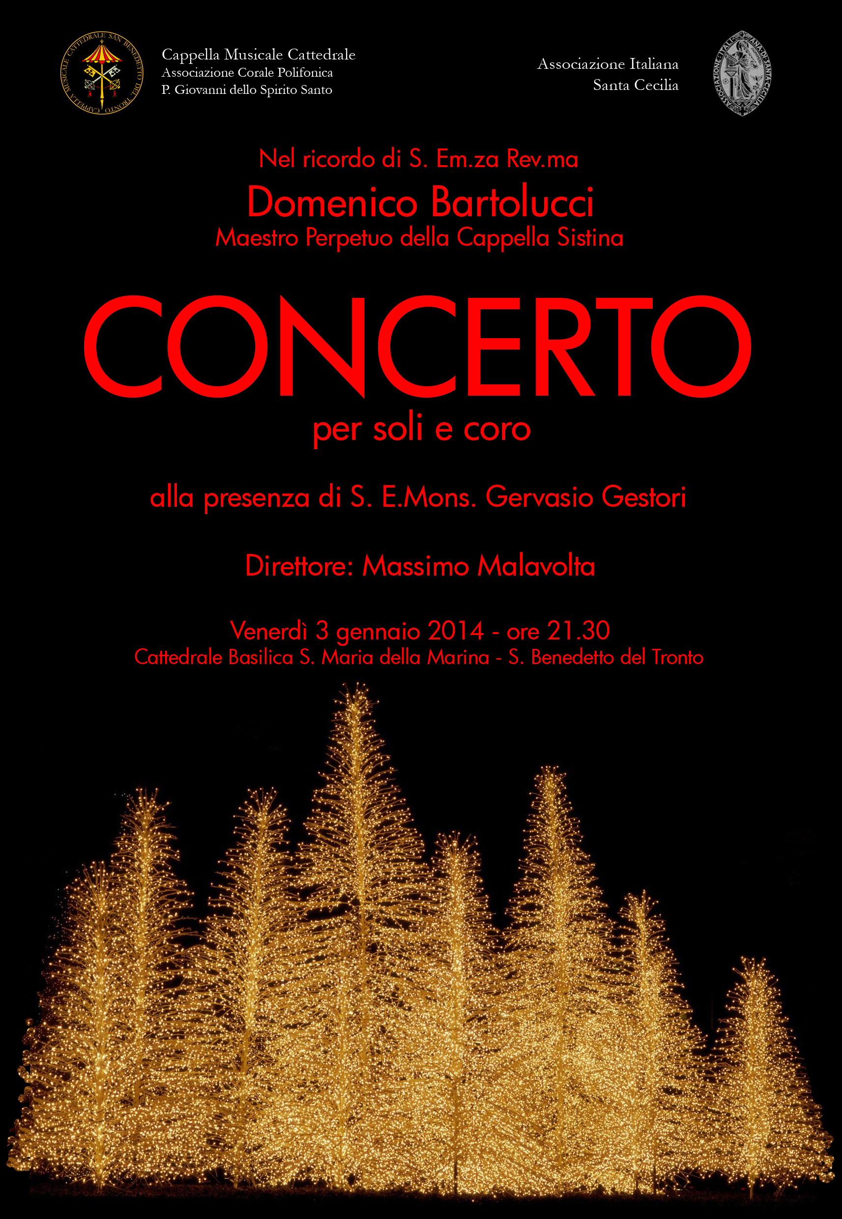 SAN BENEDETTO DEL TRONTO – Questa sera alle ore 21,30, presso la Cattedrale Basilica S. Maria della Marina a S. Benedetto del Tronto la Cappella Musicale Cattedrale – Associazione Polifonica Corale “P. Giovanni dello Spirito Santo”, alla presenza di S. E. Mons. Gervasio Gestori, offrirà il tradizionale concerto di natale e con l’occasione farà memoria di Sua Eminenza il Cardinale Domenico Bartolucci, già Maestro perpetuo della Cappella Sistina, scomparso lo scorso novembre.