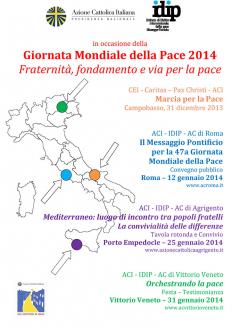 A Roma il 12 gennaio, con un Convegno pubblico sul tema del messaggio pontificio per la giornata mondiale della pace 2014, “Fraternità, fondamento e via per la pace”. sabato 25 gennaio 2014 a Porto Empedocle all’interno di una nave attraccata nel porto cittadino, si svolgerà una tavola rotonda con convivio sul seguente tema: “Mediterraneo, luogo d’incontro tra popoli fratelli. La convivialità delle differenze”. Il 31 gennaio a Vittorio Veneto, dove verrà animata la Festa-testimonianza dal titolo “Orchestrando la pace”, con musica, ospiti ed esperienze di pace che coinvolgeranno la comunità cittadina ed alcuni giovani provenienti dall’intero territorio nazionale intorno al tema della fraternità e alla gioia che discende dal servizio e dalla condivisione, sulle orme del beato Giuseppe Toniolo che era della diocesi di Vittorio Veneto.