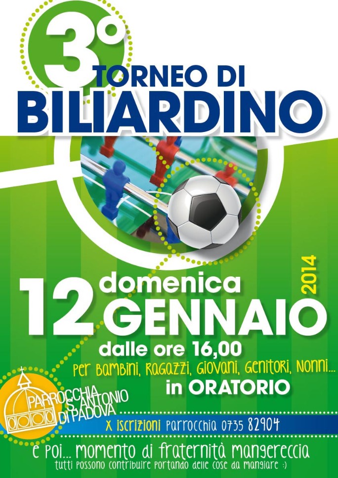 SAN BENEDETTO DEL TRONTO – Domenica 12 gennaio si terrà il terzo torneo di biliardino presso la Parrocchia di Sant’Antonio a partire dalle ore 16.00