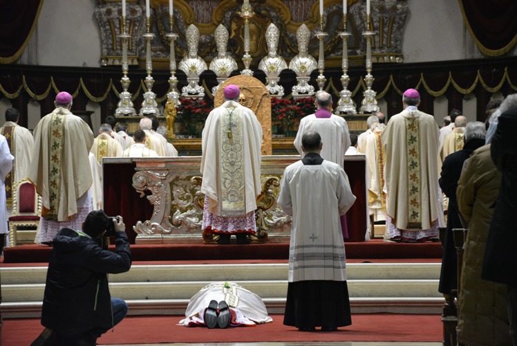 È all’interno di questo disegno, carissimo don Carlo, che vieni ordinato vescovo: per contribuire, insieme al tuo presbiterio, a fare nuovo il mondo secondo il disegno di Dio. (…) Questo disegno non è altro che ciò che gli uomini costruiranno quando saranno abbastanza attenti, intelligenti, autocritici, e soprattutto abbastanza santi da lasciarsi muovere abitualmente dallo Spirito Santo a compiere le scelte più giuste, quelle che fanno vivere l’uomo e lo fanno crescere verso la pienezza dell’amore di Dio e del prossimo (…). Il disegno è bello e grande, e val bene la dedizione della propria vita. Eppure tutto è cominciato, si direbbe, sub contrario, con Gesù che si sottomette umile al battesimo di Giovanni. (…) L’abbassamento reale in una scelta di umiltà permette di diventare strumenti autentici dell’azione di Dio. Umiltà viene da humus, ‘terra’; è il riconoscimento che l’uomo è terra; certo, l’uomo è anche pensiero, è sentimento, è azione morale, è nobiltà, è arte, è scienza, è mille cose grandi e ammirevoli, ma nel vivere tutte queste cose egli è e rimane terra. Se lo ricorda, potrà fare cose grandi; se lo dimentica, potrà solo accendere fuochi d’artificio, che bruciano in un attimo. Così è della vita di un vescovo: deve partire dal farsi terra, umile. (…). Ora dovrai sdraiarti per terra e rimanere sdraiato mentre noi pregheremo per te Dio, la Madonna e tutti i santi del cielo perché ti proteggano e ti facciano essere un vescovo vero; perché tu non abbia a scambiare l’episcopato per una grandezza mondana che ti autorizza a dominare (…).