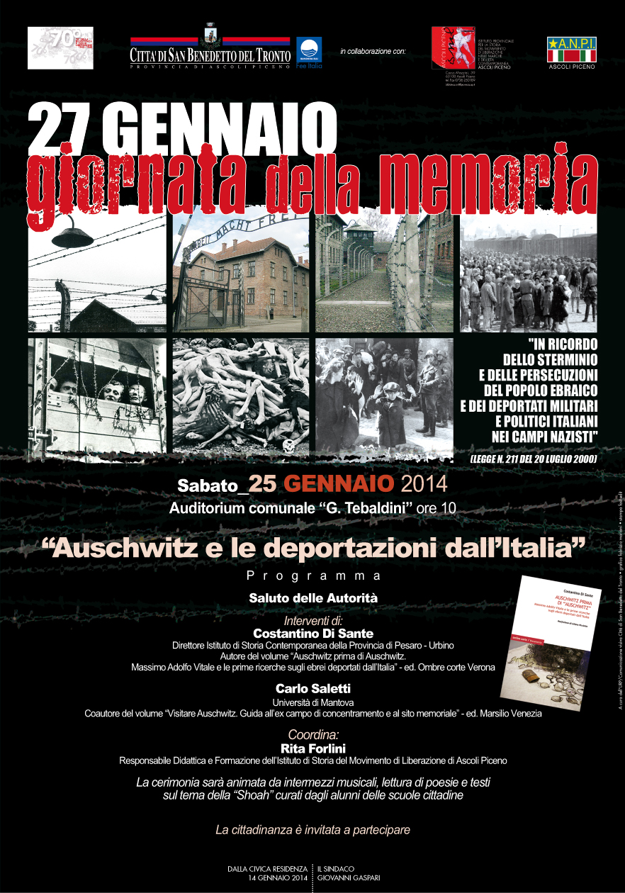 Dopo i saluti delle autorità, interverranno due studiosi: Costantino Di Sante, direttore dell’Istituto di Storia Contemporanea della Provincia di Pesaro – Urbino e autore del volume “Auschwitz prima di Auschwitz. Massimo Adolfo Vitale e le prime ricerche sugli ebrei deportati dall’Italia” (ed. Ombre corte Verona), e Carlo Saletti dell’Università di Mantova, coautore del volume “Visitare Auschwitz. Guida all’ex campo di concentramento e al sito memoriale”, ed. Marsilio Venezia.