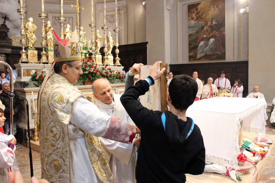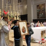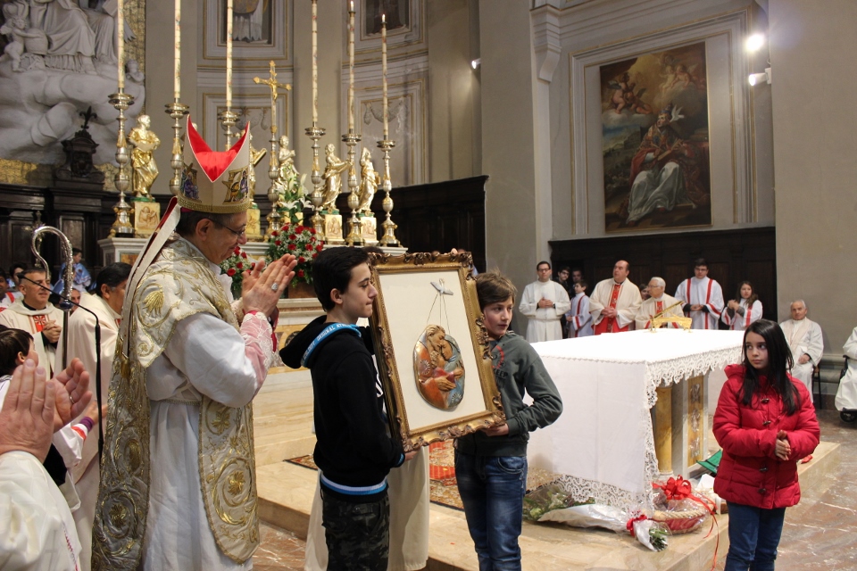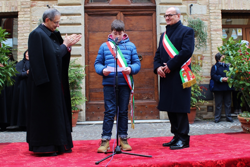 Meritevole di segnalazione è stato anche l’intervento del giovane Lorenzo Maroni, Sindaco dei Ragazzi di Ripatransone, il quale ha letto un bellissimo messaggio al nostro Vescovo. Il Sindaco Bruni ha consegnato al Vescovo una riproduzione in argento della Madonna di San Giovanni.