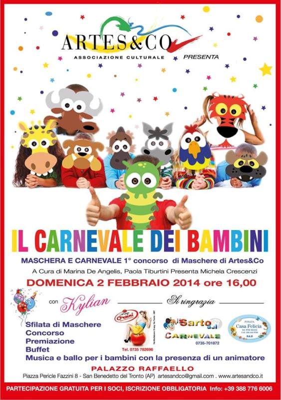 SAN BENEDETTO DEL TRONTO – L’associazione Artes&Co ritorna alla carica con una nuova iniziativa: Il Carnevale dei bambini. Domenica 2 febbraio alle ore 16:00, l’associazione aspetta tutti i bimbi presso Palazzo Raffaello, in piazza Pericle Fazzini 8, San Benedetto del Tronto, rigorosamente in maschera per un pomeriggio di divertimento: la sfilata di maschere, il concorso Maschere di Artes&Co con tanti premi, un bel buffet con musica e ballo per i bambini con la presenza di un animatore, il tutto a cura di Marina de Angelis, Paola Tiburtini e come presentatrice Michela Crescenzi. La partecipazione è gratuita per i soci. Per info telefonare a 3887766006