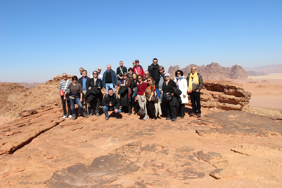 Giunti in Giordania abbiamo incontrato la guida locale e dopo aver fatto un breve viaggio in pullman siamo saliti su delle jeep con cui abbiamo attraversato le terra di Edom (luogo attraversato anche da Mosé insieme al popolo di Israele nel suo viaggio verso la Terra Promessa) per raggiungere la località denominata Wadi room, parco stupefacente con reperti geologici e ancor di piu’per la fantasia nella forma delle rocce.