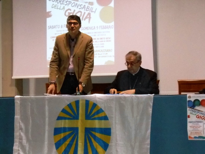 Azione, di che azione si tratta? Ha chiesto Sua Eccellenza. Certamente la vita cristiana senza uno spazio orante e adorante nella contemplazione del mistero di Dio, non potrà mai avere avere quello spessore che rende capaci di un azione illuminata nel mondo di oggi. Il Vescovo ha continuato dicendo che siamo chiamati a quella missione che fa parte dell’essenza stessa della Chiesa: annunciare il Vangelo ad ogni creatura, dimensione missionaria a cui ci chiama insistemente anche Papa Francesco. Il rapporto intimo con Cristo, che è proprio del cristiano, deve essere curato da ogni aderente all’AC, per operare ed agire affinché le forme della vita sociale, nella quale noi siamo, siano plasmate dal vento della carità di Cristo. Bisogna agire perché il Vangelo penetri in noi e nella società attraverso la presenza attiva che ne plasmi le strutture assumendo le nostre specifiche responsabilità laicali nei contesti di vita in cui siamo chiamati a vivere. Riflettere insieme nell’asociazione aiuta e sostiene l’azione del singolo in contesti che spesso non sono facili; non da soli, quindi, ma in associazione con altri, cercando di coinvolgere altri. Ci si forma insieme per agire insieme, potenziando la capacità di incidere con propria testimonianza cristiana. Riflettere insieme alla luce del Vangelo, secondo le proposte della vita associativa, aiuta a comprendere e a giudicare lo spirito del tempo dal quale, altrimenti, rischieremmo di farci assorbire; sollecitandoci insieme è più facile restare svegli. Quindi c’è bisogno di una forte coesione dell’associazione.