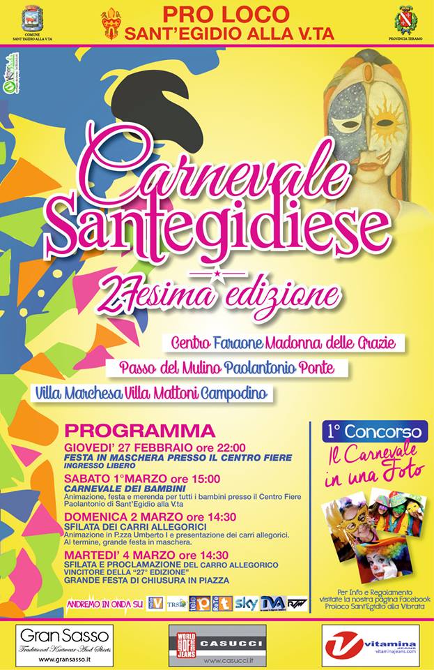 SANT’EGIDIO ALLA VIBRATA – Torna l’atteso appuntamento con il Carnevale di Sant’Egidio alla Vibrata dal 2 al 4 marzo 2014. Ad inaugurare la 27° edizione del Carnevale santegidiese sarà il neo eletto presidente della locale Pro Loco Vincenzo Odorisi.