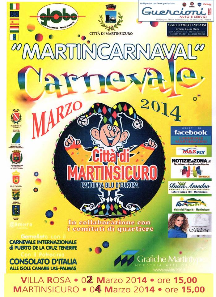 MARTINSICURO – L’associazione truentina “Martin Carnaval”, capitanata dal proprio presidente Giovanni Corsi, con il patrocinio del comune di Martinsicuro ed in collaborazione con i comitati di quartiere, organizza la 13° edizione del Carnevale 2014. L’evento è gemellato con il Carnevale Internazionale di Puerto de La Cruz (Tenerife) e patrocinato dal Consolato Italiano delle Isole Canarie a Las Palmas. Gli organizzatori sono già a lavoro per la realizzazione dei costumi e dei carrozzoni da sfilata, ciascuno con il proprio tema dedicato: Nuova Rosa con “Il Castello dei Mostri”, Campo Casone con “Il Mistero di Atlantide”, Giardino con “Viva le maschere”, Sacro Cuore con “Brazil 2014” e Santa Rita con “Il Re Leone”.