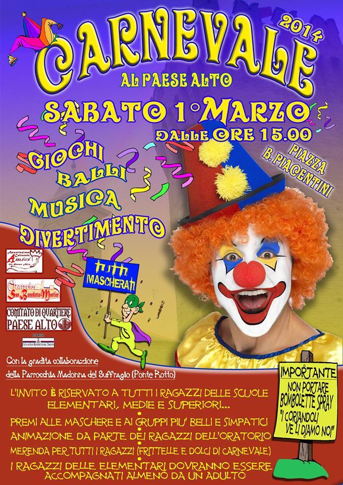 SAN BENEDETTO DEL TRONTO – Al Paese Alto di San Benedetto la proposta per il carnevale è rivolta ai ragazzi di ogni fascia d’età, per passare il pomeriggio di Sabato 1 Marzo divertendosi insieme. Dalle 15 alle 19, in piazza Bice Piacentini, si farà festa in maschera con musica, balli e giochi per bambini delle elementari e delle medie, ai quali sarà distribuita gratuitamente una merenda a base di frittelle e dolci tipici di carnevale, mediante la presentazione di un buono che sarà distribuito all’ingresso a ciascun ragazzo.