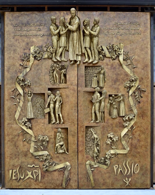 Così Paolo Annibali, uno dei più noti artisti italiani, scrive a proposito della sua ultima opera: ““La ‘Porta degli Emigrati’ cerca di fondere valori di una cultura prettamente devozionale con valori estetici della contemporaneità. Il sentimento della devozione nasce dal bisogno di consolazione, dalla necessità e urgenza di compensare il senso di incompletezza, ma anche per ricevere un aiuto spirituale, e non solo, da parte del santo. Ho pensato così di ispirarmi alla forma di un comune ex voto, un cuore di metallo, più o meno prezioso, spesso presente in numerose copie in tutti i santuari. L’ho ingigantito portandolo ad una grandezza tale da fornire l’intero impaginato della porta, così da diventare un gigantesco ex-voto, dono al santo da parte della devozione popolare. Il perimetro del cuore è costituito da mazzi di gigli che, innalzandosi, formano le curve dello stesso. In alto, dirigendosi verso la statua del santo, si incurvano in prossimità dell’incontro con San Gabriele. Il santo domina tutta la composizione ed è innalzato in un momento di estasi: attorniato da due ali di giovani forma una croce umana diventando il simbolo dei Passionisti. All’interno del cuore sono collocate in maniera sintetica storie di diversa natura in riferimento al mondo dell’emigrazione abruzzese, ad alcuni miracoli del santo e agli alpini. In alto si compone la celebre frase del santo tratta da una lettera al padre “La mia vita è una continua gioia, la contentezza che io provo è quasi indicibile…Non cambierei un quarto d’ora di questa vita”. In basso risalta una scritta in latino che richiama il simbolo dei Passionisti e di San Gabriele”.