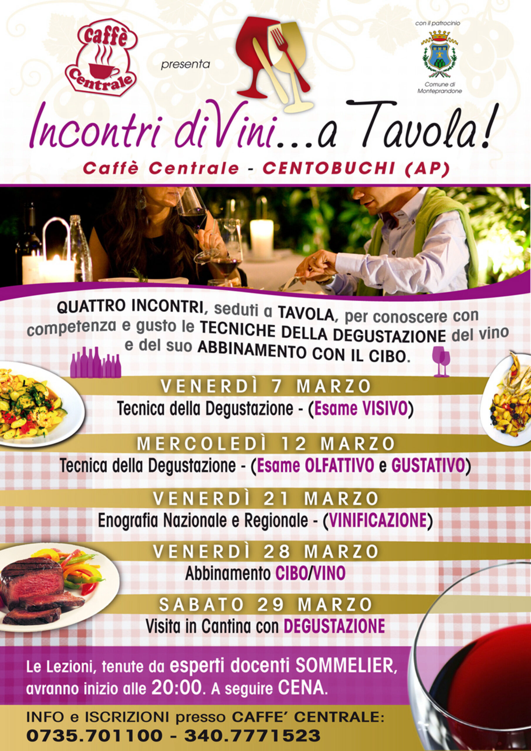 Il piceno con la sua ruralità e la sua storia di terra di buona cucina non ha mai perso le sue radici e l’iniziativa organizzata dal titolare del Caffè Centrale di Centobuchi di Monteprandone si inserisce in questo settore.Stiamo parlando di “IncontridiVini… a tavola” che prenderà il via il 7 marzo presso il Caffè Centrale alle ore 20,00 in cui esperti docenti sommelier tratteranno il tema”Tecnica della degustazione dei cibi con esame visivo” e cena a seguire. Dunque lo schema di ogni incontro si articolerà in due parti: teoria e pratica.