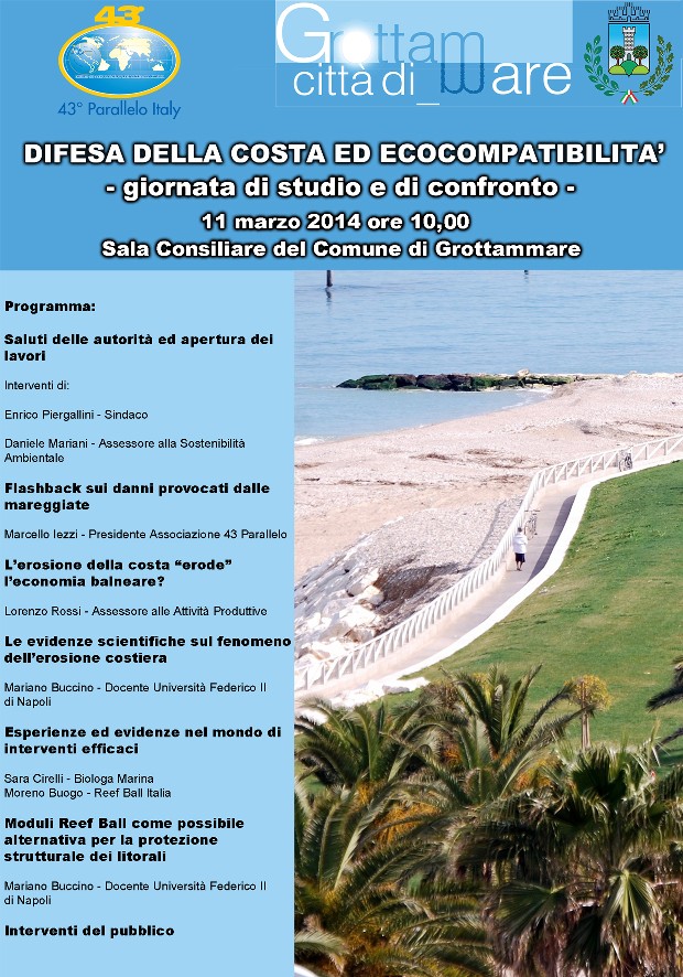 Con l’organizzazione dell’iniziativa, gli assessorati alla sostenibilità Ambientale e alle Politiche contro la crisi si sono fatti portavoce dell’associazione 43° Parallelo Italy che aveva segnalato l’occasione di approfondire alcuni aspetti dell’erosione marina facendo riferimento all’esperienza di alcune località turistiche, dove la difesa delle spiagge è stata affrontata con successo ricorrendo a metodi alternativi alle tradizionali barriere frangiflutti.