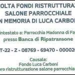 VALTESINO – La nostra Parrocchia Madonna di Fatima, in questi giorni, è un po’ tutto un cantiere. Fervono, infatti, i lavori di ristrutturazione del nostro Salone Parrocchiale “Don Ubaldo Grossi” e si sta realizzando una colonna votiva di fronte all’ingresso della nostra Chiesa Parrocchiale. In queste prime settimane di lavoro l’aspetto del nostro Salone è profondamente cambiato. E pensare che sono passate solo poche settimane da quando in questo stesso salone si è svolta la 1a Edizione del torneo di FIFA 14 PS3 a coppie in memoria di Luca Carboni, il nostro amico scomparso lo scorso 16 agosto a causa di un incidente stradale.