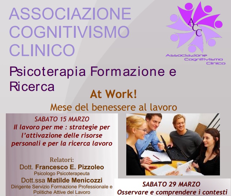 Il secondo incontro dal titolo “Osservare e comprendere i contesti lavorativi per migliorare il benessere a lavoro” si terrà sabato 29 marzo alle ore 18:00, i relatori saranno il Dott. Valerio Castellucci Psicologo Psicoterapeuta e il Dott. Stefano Girolami Funzionario Servizio Orientamento e Formazione Provincia di Ascoli Piceno. Entrambi gli incontri si terranno presso la sede dell’Associazione in V.le S. Moretti, 44 a San Benedetto del Tronto. Ingresso libero. Per info tel. 0735 587194 cognitivismoclinico@gmail.com