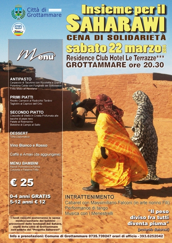 Il cabarettista Massimiliano Falconi, in arte Nonno Filì, finalista al concorso del XXIX Festival nazionale dell’umorismo Cabaret, amoremio! (Premio della Stampa 2013), il duo I Menestrelli e una coppia di ballerini di tango assicureranno l’intrattenimento durante la cena. La quota di partecipazione è di 25 euro, comprensiva del contributo di 10 euro. I fondi raccolti sono destinati a sostenere l’ospitalità nei mesi di luglio e agosto di una ventina di bambini bisognosi di cure mediche specializzate, impossibili da praticare negli ospedali da campo attrezzati nelle tendopoli del deserto algerino dove il popolo Saharawi trova rifugio dal 1975.