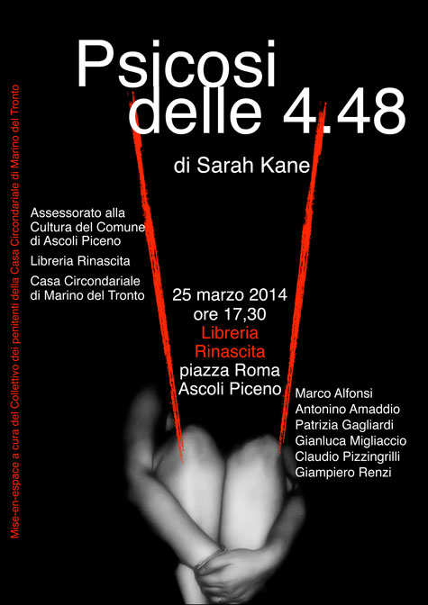 E’ questo “Psicosi delle 4.48” della drammaturga inglese Sarah Kane, 28 anni, morta suicida dopo aver completato l’opera, rielaborato dal laboratorio di Lettura e Scrittura del carcere di Marino. Il testo, che rientra nella scuola drammaturgica degli arrabbiati inglesi, è stato adattato dal Laboratorio e verrà interpretato da quattro detenuti: Piero Renzi (monologo), Antonino Amaddio, Marco Alfonsi e Gianluca Migliaccio (medici-aguzzini-spettri che si aggirano intorno alla figura protagonista). L’appuntamento è per martedì 25 marzo alle 17.30 presso la libreria Rinascita di Piazza Roma ad Ascoli. Ingresso libero.