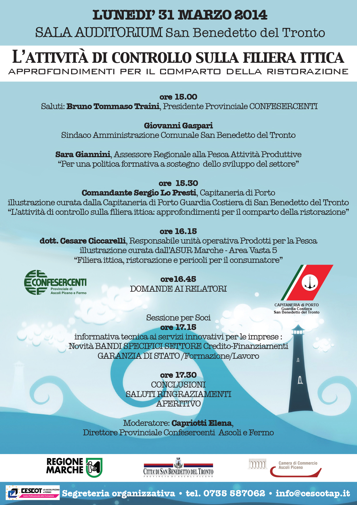 SAN BENEDETTO DEL TRONTO – Il convegno organizzato dalla Confesercenti “L’attività di controllo sulla filiera Ittica – approfondimenti per il comparto della ristorazione”, si terrà lunedì 31 Marzo alle ore 15:00 presso l’Auditorium del Comune di San Benedetto del Tronto, in collaborazione con la Capitaneria di Porto.