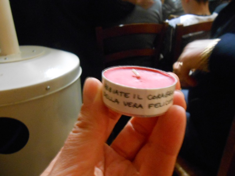 Durante la serata, la parrocchia ha voluto far dono ai presenti di un lumino, con la seguente scritta: “Abbiate il coraggio di essere felici”, per ricordarci di non accontentarci, di non vivacchiare. E come ultima raccomandazione, Francesca ha invitato tutti a non stare mai da soli, a cercare sempre di stare in un gruppo che abbia, però, delle fondamenta solide, e più solide di quelle che la Chiesa può dare è difficile trovarle!