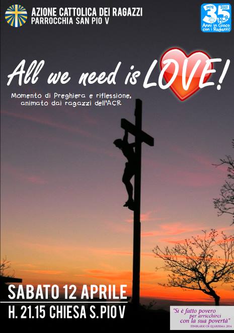 Si conclude l’ itinerario di Quaresima dell’AC della Parrocchia di San Pio V “Si è fatto povero per arricchirci con la sua povertà” che ha coinvolto giovani, giovanissimi, adulti e famiglie per tutti i venerdì di quaresima. Siete tutti invitati per un momento di preghiera e riflessione curato e animato dai ragazzi dell’ACR, sul tema delle ultime sette parole che Gesù ha pronunciato sulla croce. Vi aspettiamo per la Veglia delle Palme 2014, Sabato 12 ore 21.15 in chiesa!