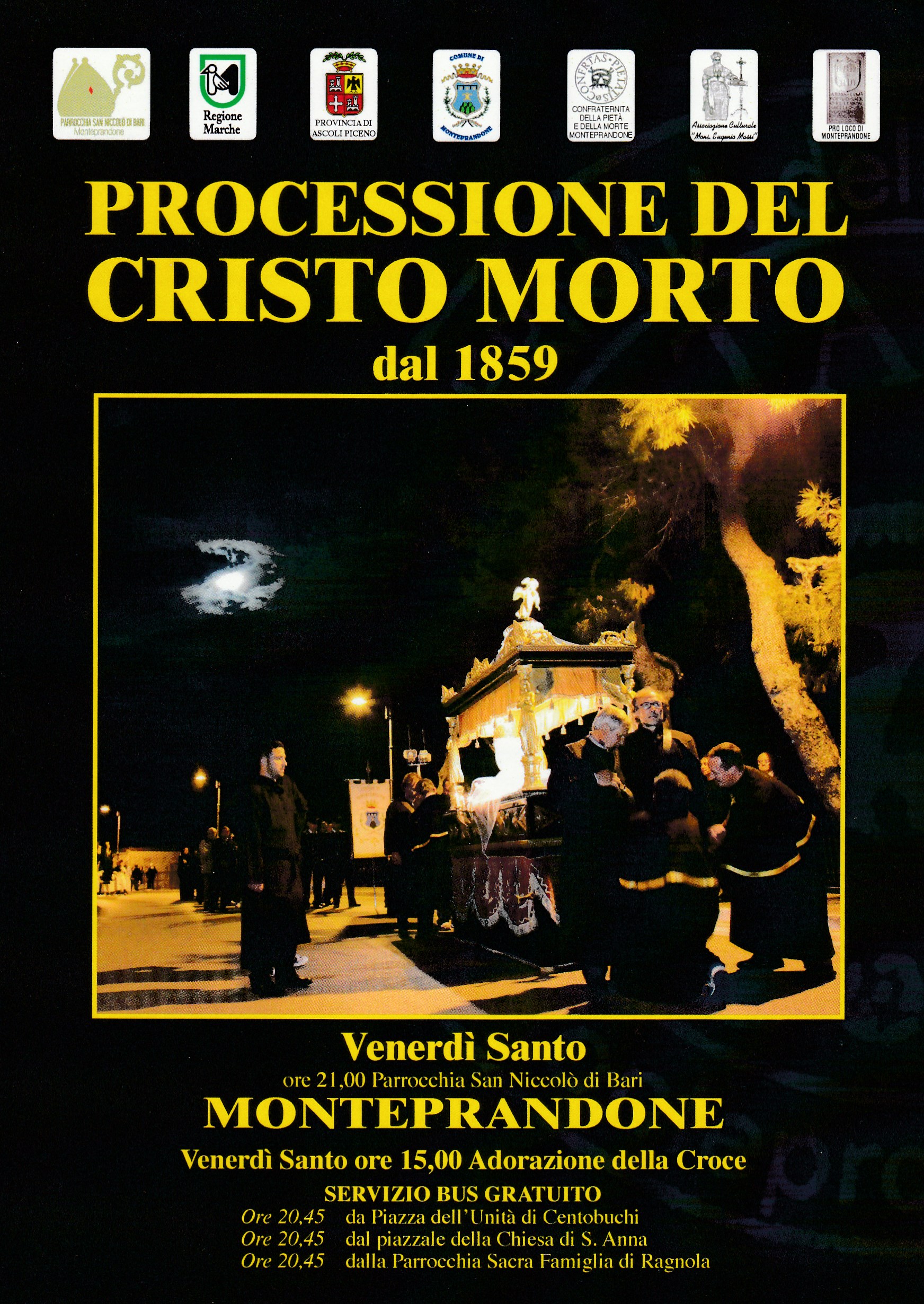 A distanza di poco più di un mese il nostro Vescovo torna in terra monteprandonese per l’avvenimento clou dell’anno liturgico: la storica e civica processione del Cristo Morto che dal 1859, ininterrottamente, ogni anno, la sera del Venerdì Santo, ripercorre le caratteristiche rue dell’incassato medioevale dove hanno sede i musei dei codici di San Giacomo della Marca, di arte sacra, la casa natale di San Giacomo e l’imponente chiesa parrocchiale di S. Nicolò.