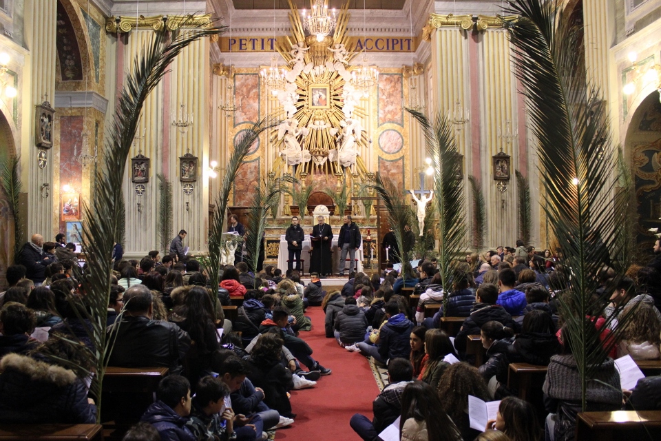 Nella Sala Consiliare i ragazzi hanno assistito ad una rappresentazione, messa in scena da alcuni coetanei dove, partendo dai desideri e dai dubbi tipici degli adolescenti, i ragazzi sono andati alla ricerca di una risposta, un punto fermo che è il desiderio non di cose materiali ma di amare e aprirsi alla vita e agli altri. Nell’Auditorium, invece, i ragazzi più grandi hanno ascoltato una riflessione sul crocifisso tenuta da don Vincenzo Catani, il quale ha guidato i giovani attraverso un percorso sul significato che la croce ha assunto nel corso dei secoli, partendo dalla prima rappresentazione della croce: un disegno graffito dove si vede una croce a cui è appeso un uomo con la testa di asino, un segno di disprezzo per un dio che muore crocifisso, inconcepibile per i pagani del tempo; poi, nel corso dei primi secoli, il Cristo sulla croce non veniva rappresentato, ma si potevano trovare le gemme, cioè il segno del trionfo di cristo, solo dopo si incomincia a rappresentare il Cristo uomo, ma è ancora un cristo trionfatore, per poi arrivare all’epoca di San Francesco che mette in evidenza l’umanità di Gesù, a immagine e somiglianza dell’uomo che soffre, oggi si arriva a rappresentare il Cristo morto e risorto come nel crocifisso di P. Annibali, 1996 nella chiesa di S. Pio X di San Benedetto del Tronto. Al termine, dopo una breve riflessione, ad ogni ragazzo è stato chiesto di esprimere quello che la figura del cricifisso gli faceva sentire e sono venute fuori delle belle riflessioni, parole che sono state messe per iscritto su dei cartelloni.