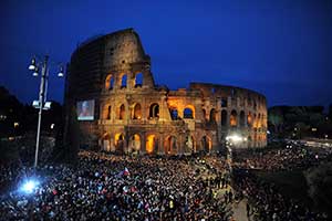 “Nella Croce vediamo la mostruosità dell’uomo quando si lascia guidare dal male e dal peccato, ma vediamo anche l’immensità della misericordia di Dio che non ci tratta secondo i nostri peccati, ma secondo la sua misericordia”. Si è conclusa con una meditazione fuori programma, durata circa cinque minuti, la seconda Via Crucis di Papa Francesco. A cinquant’anni dalla prima Via Crucis al Colosseo, celebrata da Paolo VI nel 1964, e a pochi giorni dalla canonizzazione di altri due papi – Giovanni XXIII e Giovanni Paolo II – il Santo Padre ha seguito il Calvario di Gesù dal terrazzo del Palatino, in un clima di silenzio e raccoglimento. Poco prima dell’ultima stazione, era talmente assorto nella preghiera che monsignor Guido Marini, il maestro delle celebrazioni liturgiche pontificie, ha dovuto sussurrargli all’orecchio di alzarsi in piedi per accogliere l’arrivo della Croce al termine del suo percorso. Il Papa è arrivato poco dopo le 21 e ha salutato brevemente il sindaco di Roma, Ignazio Marino. La Via Crucis è iniziata alle 21.15, in diretta mondovisione – per la prima volta trasmessa anche a Cuba – e alle 22.35 il Pontefice è salito a bordo della Focus blu congedandosi dalle migliaia di persone di ogni età e provenienza che con i loro “flambeaux” – in un gioco di controcanto con le fiammelle che hanno acceso la grande Croce sullo sfondo dell’anfiteatro Flavio – hanno illuminato l’area compresa tra il Colosseo e il Palatino. Dopo quella dell’anno scorso, dedicata al Medio Oriente, la Via Crucis di quest’anno ha fatto di Roma il centro delle “croci” disseminate nella nostra Penisola, conseguenze drammatiche della crisi: ad evocarle, tramite la voce dell’attrice Virna Lisi, è stato monsignor Giancarlo Bregantini, arcivescovo di Campobasso-Bojano, che ha scelto la forma tradizionale delle quattordici stazioni, con tre cadute. A portare la Croce, affidata nella prima e nell’ultima stazione al vicario generale di Sua Santità per la diocesi di Roma cardinale Agostino Vallini, sono state circa trenta persone: tra di loro operai, imprenditori, disoccupati, bambini, famiglie, malati, operatori del mondo del carcere e delle comunità di recupero, persone senza fissa dimora.