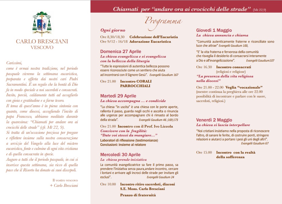 Mercoledì 30 mattino, dalle ore 10,00, il consueto Incontro diocesano del Clero per tutti i sacerdoti diocesani e religiosi e i diaconi, animato dal nostro Vescovo Mons. Carlo Bresciani, desiderando essere una Chiesa che prende iniziativa; il papa dice: “La comunità evangelizzatrice sa fare il primo passo, sa prendere l’iniziativa senza paura,andare incontro, cercare i lontani e arrivare agli incroci delle strade per invitare gli esclusi”. Evangelii Gaudium 24