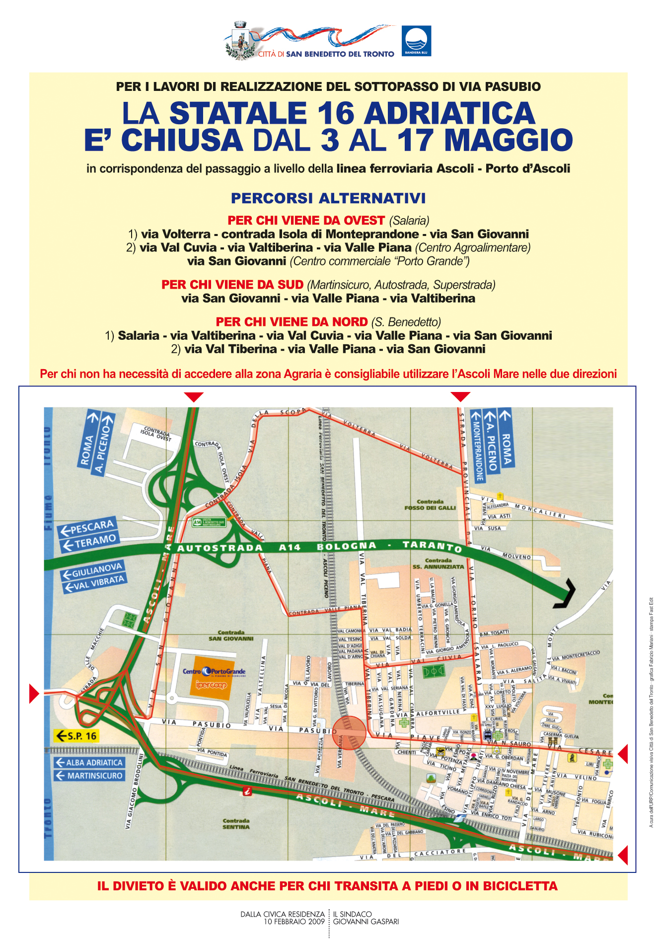 La Polizia Municipale ha provveduto a posizionare apposita cartellonistica lungo tutte le principali strade di accesso al quartiere Agraria che avvisa dell’interruzione e indica i percorsi alternativi. Per chi non ha necessità di accedere alla zona Agraria è consigliabile utilizzare l’Ascoli Mare nelle due direzioni. Per chi invece deve recarsi nell’area interessata dal divieto, queste le soluzioni.