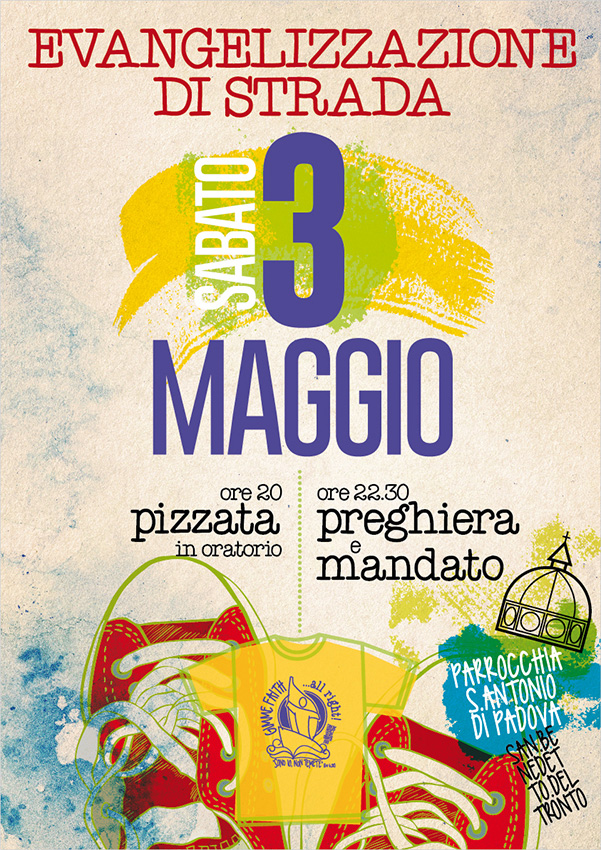 SAN BENEDETTO DEL TRONTO – Proseguono gli incontri in preparazione all’evangelizzazione di strada che si terrà durante l’estate (dal 29 Luglio al 3 Agosto) con una serata presso la parrocchia S.Antonio di Padova che propone, per Sabato 3 Maggio, un momento di convivialità, con pizzata in oratorio alle ore 20, seguito, alle 22.30 da un incontro di preghiera.