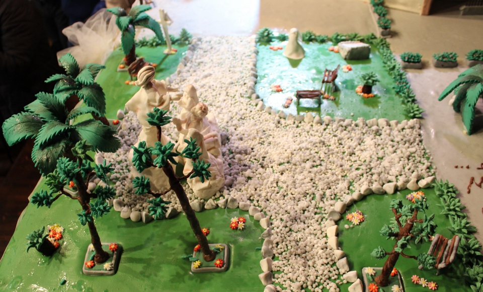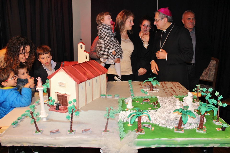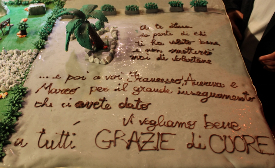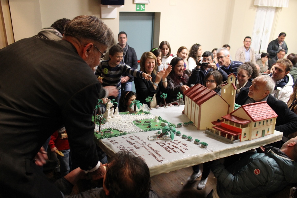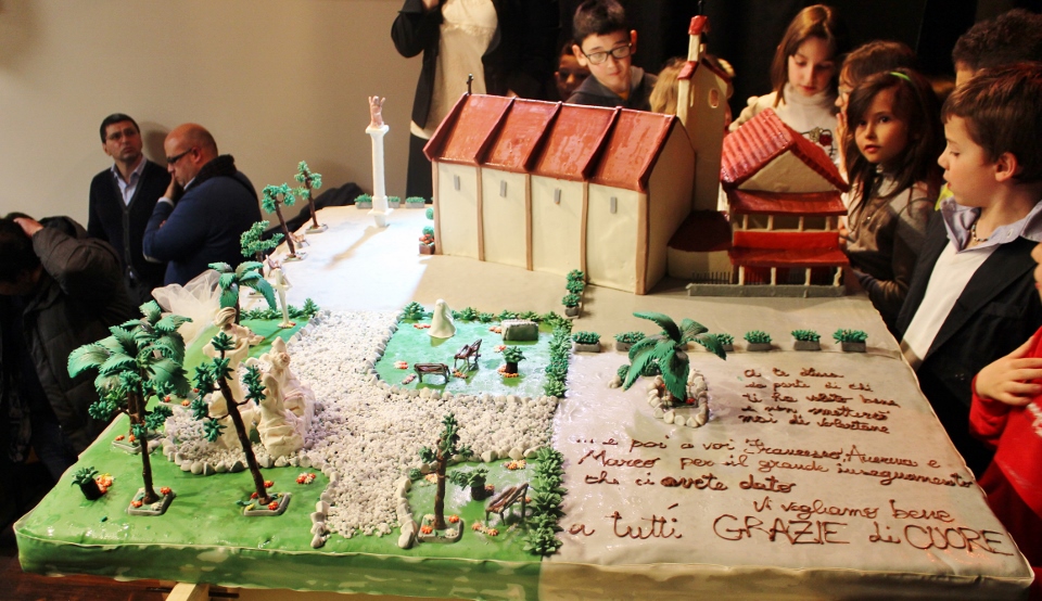 A conclusione della cena è arrivata anche una sorpresa per tutti i partecipanti. Gli amici del Borgo Miriam hanno realizzato una torta raffigurante la parrocchia Madonna di Fatima fin nei minimi dettagli, non tralasciando nemmeno il Parroco, Padre Luis.
