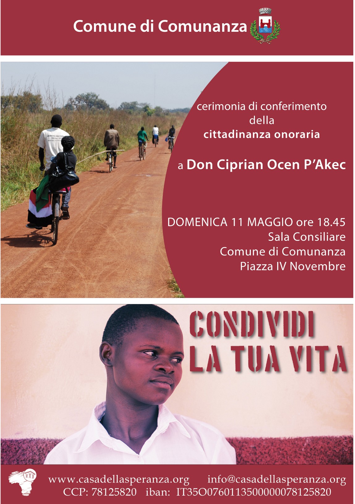 La comunità conferirà al sacerdote ugandese la cittadinanza onoraria domenica 11 maggio per mano del Sindaco Domenico Annibali alle ore 18:00 di domenica 11 maggio presso la sala consiliare del Comune di Comunanza.