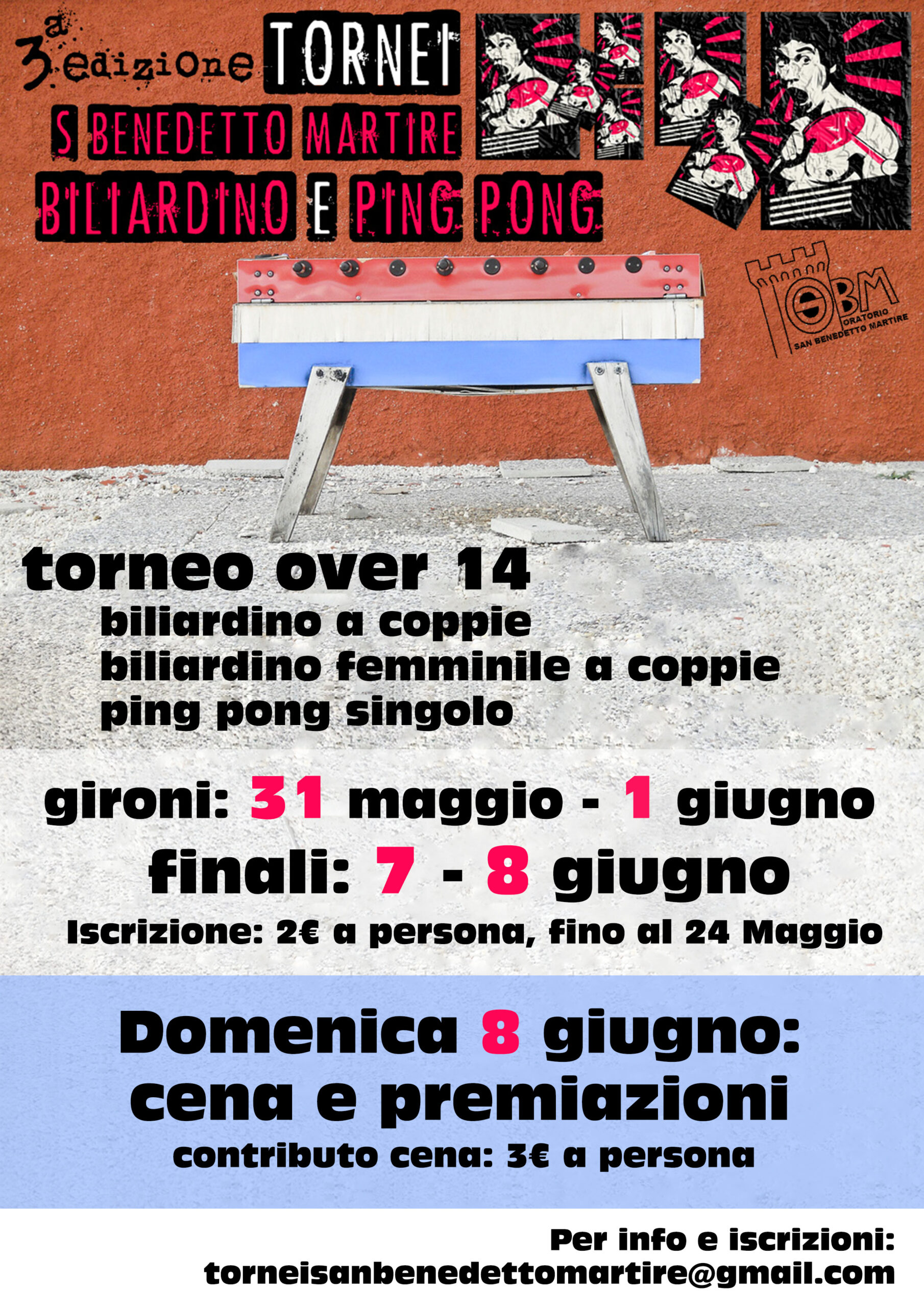 SAN BENEDETTO DEL TRONTO – Torna, per la sua terza edizione, il doppio torneo di Biliardino e Ping-Pong della parrocchia San Benedetto Martire. Il torneo, come nelle passate edizioni, è prima di tutto occasione di stare insieme mettendosi in gioco, incontrando vecchi amici e persone nuove e scontrandosi con loro in un clima di sana competizione che non prenda mai il sopravvento sul valore della sportività.