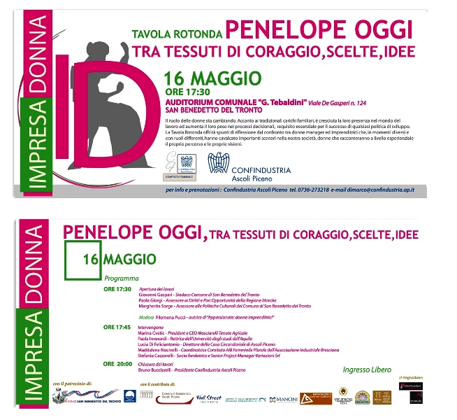 L’ultimo appuntamento è una Tavola Rotonda “Penelope oggi tra tessuti di coraggio, scelte, idee”, in programma per il 16 maggio alle ore 17.30 presso l’Auditorium Comunale “G. Tebaldini” di San Benedetto del Tronto, che vede coinvolte una serie di figure femminili che ricoprono dei ruoli di direzione, alcuni dei quali di appannaggio prettamente maschile, che hanno avuto successo ognuna nel proprio ambito. Le relatrici racconteranno a livello esperienziale il proprio percorso e condivideranno le proprie visioni; inoltre affronteranno il tema: cosa vuol dire essere una donna affermata nel proprio settore, con le difficoltà che si affrontano quotidianamente, andando ad approfondire sia gli aspetti dell’anima femminile, che inevitabilmente influenzano ed ispirano le azioni, le decisioni e le innovazioni, sia il rapporto che si instaura con il mondo maschile.