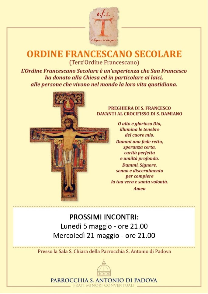 SAN BENEDETTO DEL TRONTO – La Parrocchia di Sant’Antonio invita a partecipare al secondo incontro per il mese di Maggio con il Terz’ordine Francescano Secolare.
