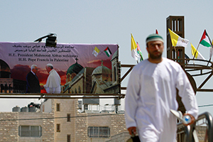 Fervono i preparativi in piazza della Mangiatoia a Betlemme dove Papa Francesco celebrerà la Messa domenica 25 maggio, nella sua seconda tappa del viaggio apostolico in Terra Santa. Anche il check point israeliano all’ingresso della città sembra essersi rivestito a nuovo, con l’alto muro di separazione completamente ritinteggiato, quasi a voler cancellare con un colpo di pennello, una dura occupazione militare che stringe alla gola Betlemme. Intorno al grande palco che ospiterà l’altare lavorano diversi operai, centinaia di sedie bianche vengono ordinate all’interno delle aree predisposte pronte ad accogliere i circa diecimila cristiani attesi da tutta la Palestina e Israele. Ci si chiede dove si sistemeranno, visto che lo spazio è occupato anche dalla struttura che dovrà ospitare il coro che in queste ore prova e riprova i canti della liturgia. Tutto intorno una miriade di bandiere palestinesi e del Vaticano. Si sistemano le transenne, si chiudono strade. Sui lampioni vengono issate immagini del Papa e di Abu Mazen, il presidente palestinese. A vigilare decine di soldati e di poliziotti con jeep militari dovunque. In giro per la città e davanti la basilica della Natività, troupe televisive catturano immagini e interviste da rilanciare. Non si vedono i nugoli di venditori di rosari e cartoline che solitamente attendono i pellegrini in arrivo.