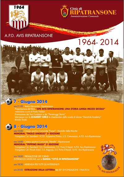 Domenica 8 ore 10:00, nella sede del Campo Sportivo Comunale “Funari” di Montalto delle Marche, per il Memorial “Paolo Angelici” V Edizione, si giocherà la partita triangolare categorie esordienti fra le squadre dell’ a.p.d. avis ripatransone – us comunanza – s.s. acquaviva. Alle ore 16:00 nel Campo sportivo comunale “La Petrella” di Ripatransone, per il per il Memorial “PeppinoMassi” III Edizione, si giocherà la partita triangolare categorie esordienti fra le squadre dell’ a.p.d. avis ripatransone – s. s. grottammare – s. s . porto d’ascoli. Mentre per la triangolare cat. piccoli amici, squadre partecipanti : a.p.d. avis ripatransone – s. s. ragnola- s. s . porto d’ascoli. Alle 18:00 premiazione dei vincitori al torneo cui seguirà l’accompagnamento della Banda Musicale, “Città di Ripatransone” ed una piacevole merenda per tutti i presenti. A concludere la bella giornata di festeggiamenti l’estrazione della lotteria, “50° DI FONDAZIONE 1964-2014”.