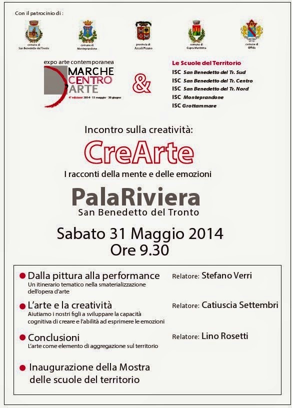 SAN BENEDETTO DEL TRONTO – Sabato 31 maggio presso il PalaRiviera di San Benedetto del Tronto si terrà CreArte – I racconti della mente e delle emozioni, incontro sulla creatività promosso da Marche Centro d’Arte e le scuole del territorio (ISC San Benedetto del Tr. Sud, ISC San Benedetto del Tr. Centro, ISC San Benedetto del Tr. Nord, ISC Monteprandone, ISC Grottammare). L’incontro inizierà alle 9.30.