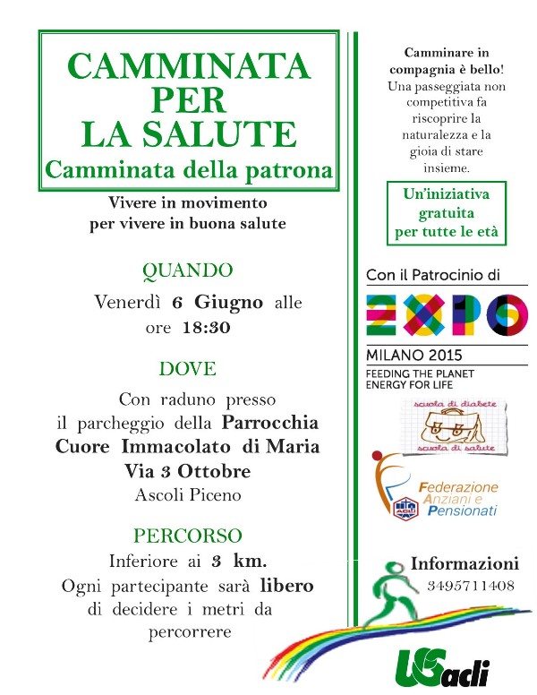 collaborazione con il comitato festeggiamenti della parrocchia del Cuore Immacolato di Maria. Alla realizzazione della manifestazione, che ha il fine di promuovere la salute ed uno stile di vita sano mediante una continua attività fisica naturale come una semplice camminata, hanno collaborato anche la Scuola di diabete (Progetto Area Vasta 5 e UNIPM) e la FAP – Federazione Anziani e Pensionati delle Acli. L’iniziativa ha ottenuto anche il patrocinio dell’Expo Milano 2015. Non occorre prescriversi. Basta presentarsi sul posto di partenza entro le ore 18,15, tutti i partecipanti riceveranno una pettorina per partecipare