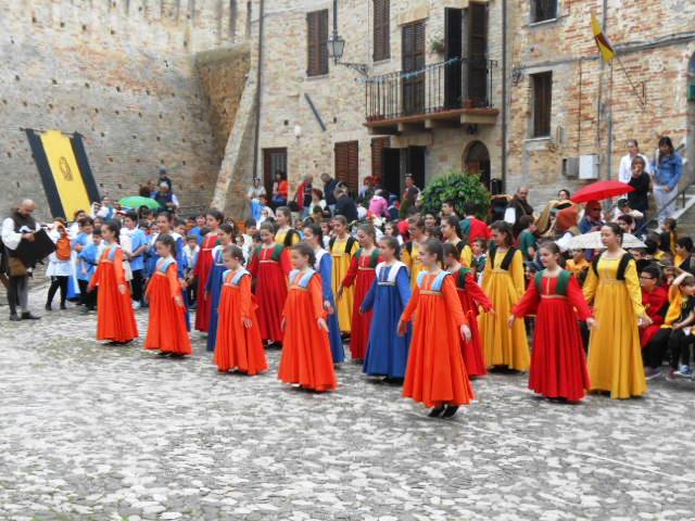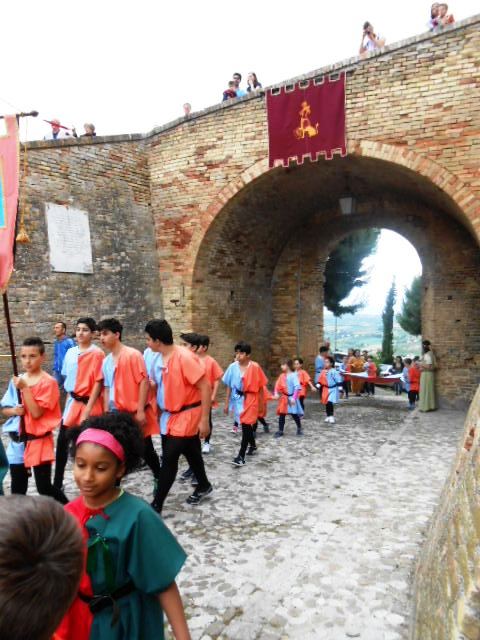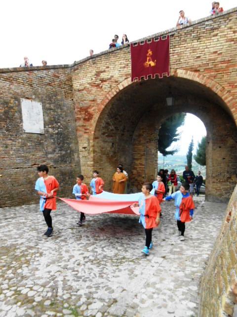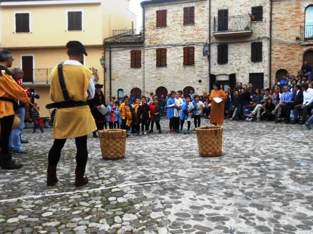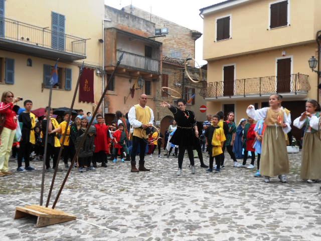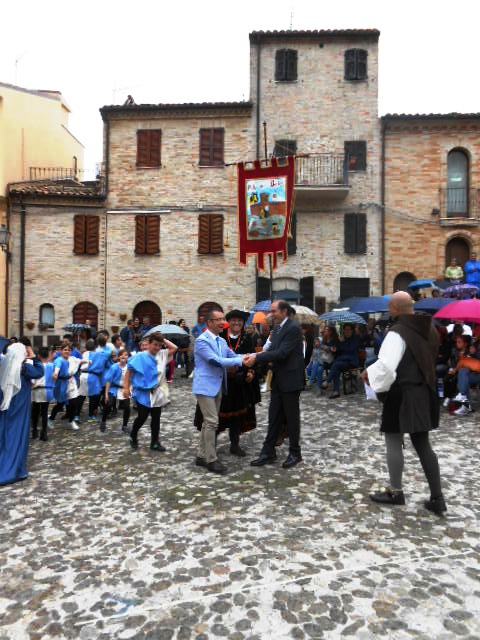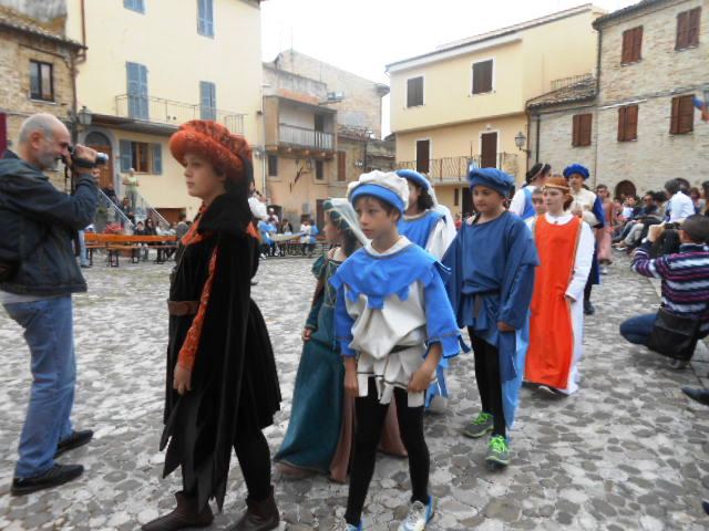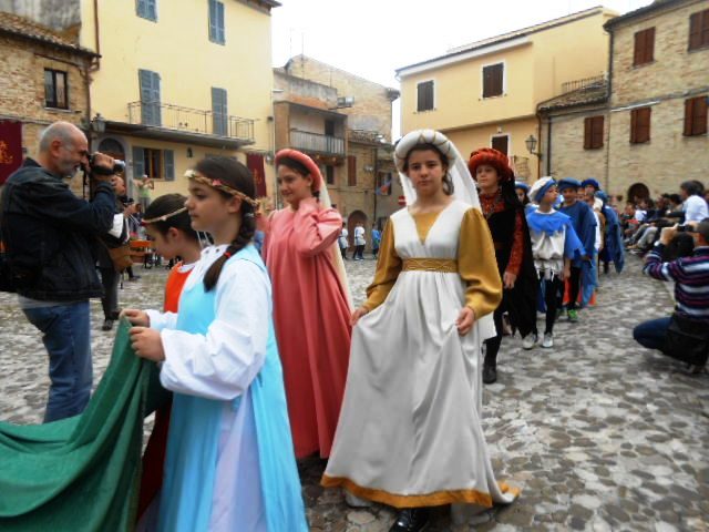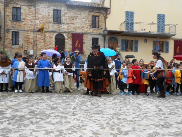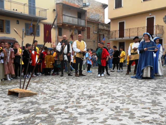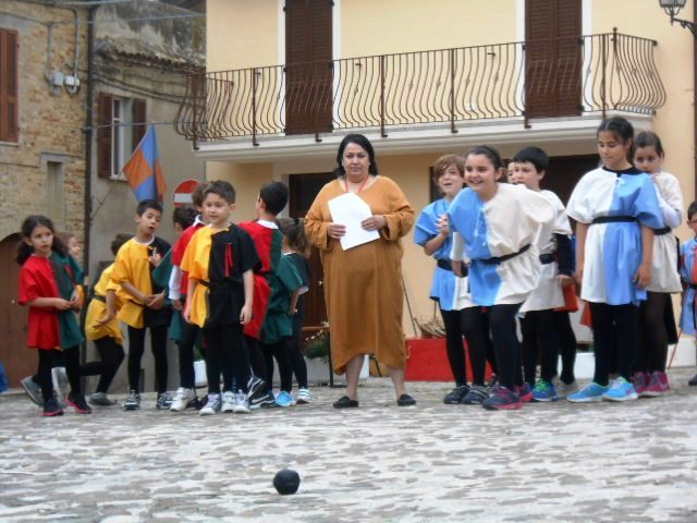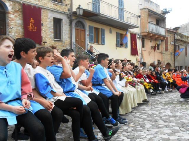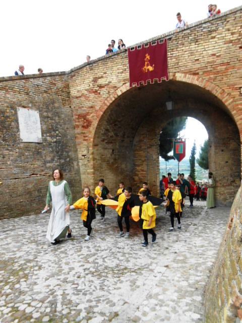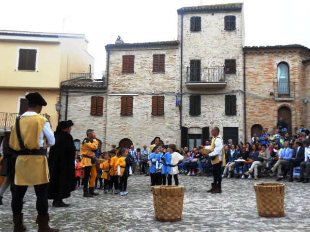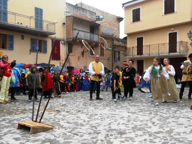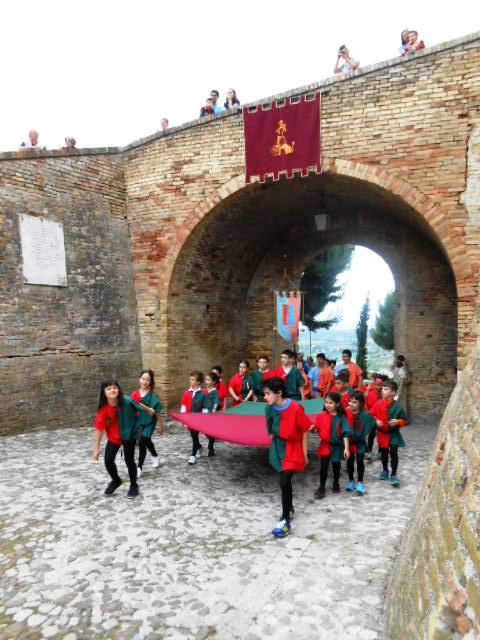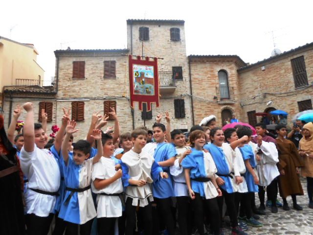 ACQUAVIVA PICENA – Sabato 31 maggio si è tenuta in piazza del Forte il Palio dei Bambini animato dagli scolari delle classi IV e V di Monsampolo del T. e di tutte le classi di Acquaviva Picena. Piazza del Forte si è riempita dei colori dei costumi dei bambini e dei 4 rioni del Palio: giallo e nero per il rione Civetta, arancione e celeste per il rione Aquila, verde e rosso per il rione Falco e bianco e celeste per il rione Picchio, quest’ultimo rappresentato dalla scuola di Monsampolo del Tronto che rappresentava anche il Gruppo dei Brunforte con Mattioli Alessio nei panni di Rinaldo dei Brunforte, Traini Denni nei panni del Duca Bonconte dei Brunforte, Impiccini Asia nei panni della Duchessa Maria dei Brunforte e Malavolta Andrea nei panni del Notaio dei Brunforte; mentre il gruppo degli Acquaviva è stato rappresentato dalla scuola di Acquaviva Picena, con Zomparelli Annalisa nei panni di Forasteria, Ciotti Mariano nei panni del Duca Rinaldo degli Acquaviva, Troiani Chiara nei panni della Duchessa Elena degli Acquaviva e Zappasodi Andrea nei panni del Notaio degli Acquaviva.