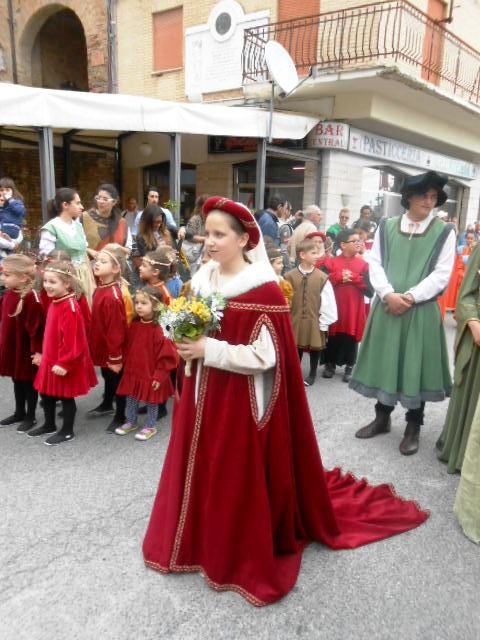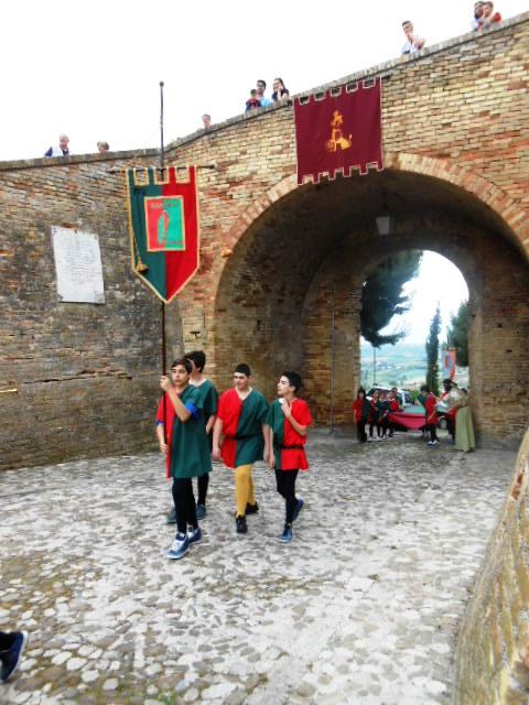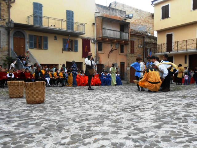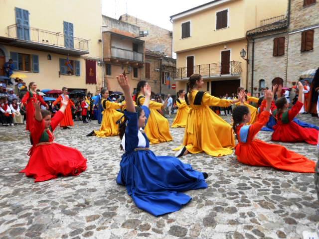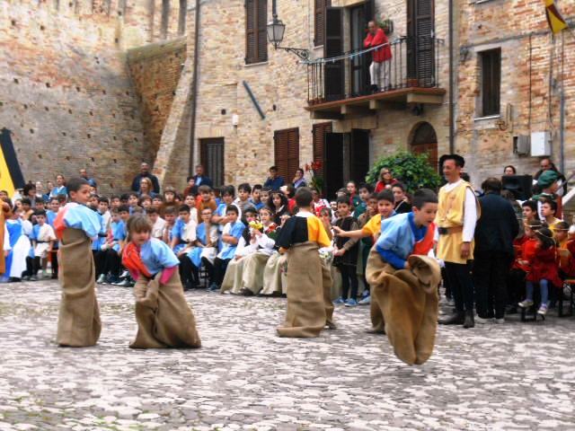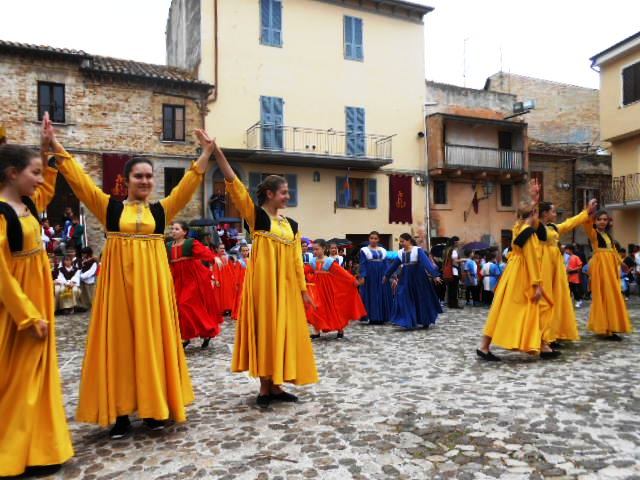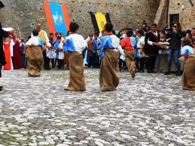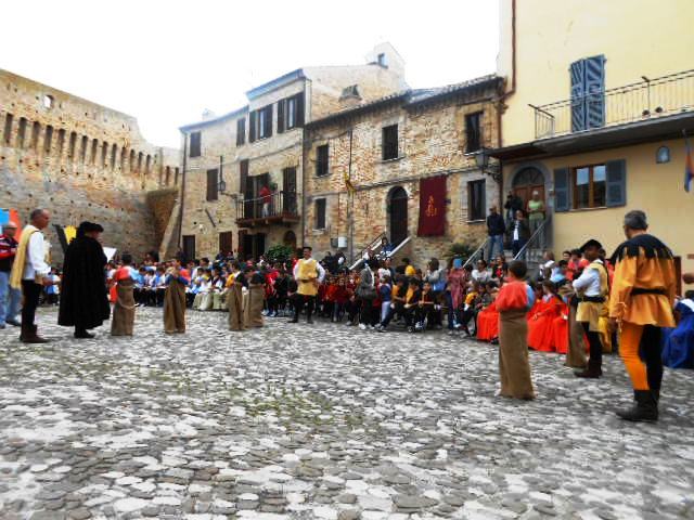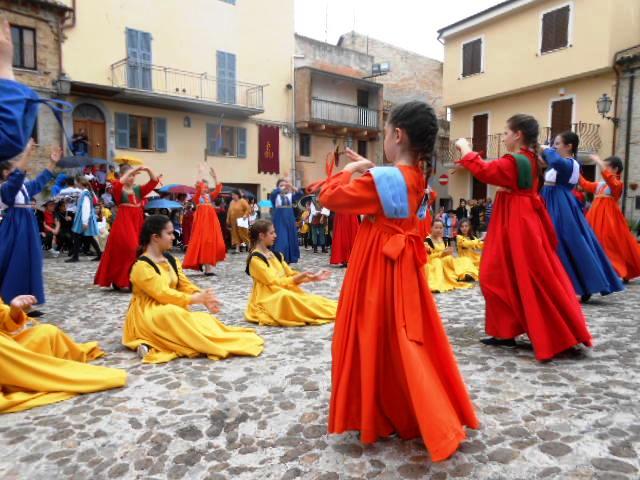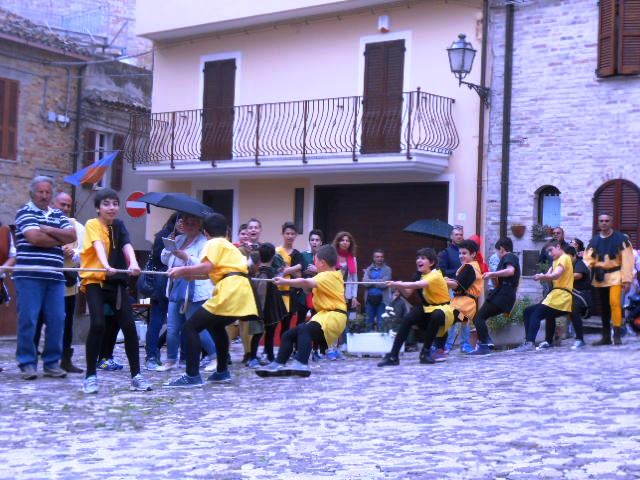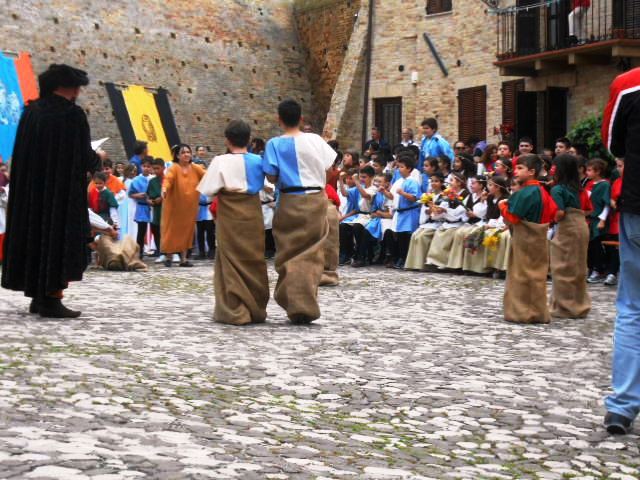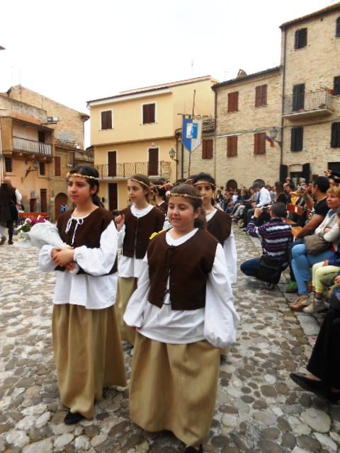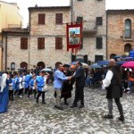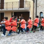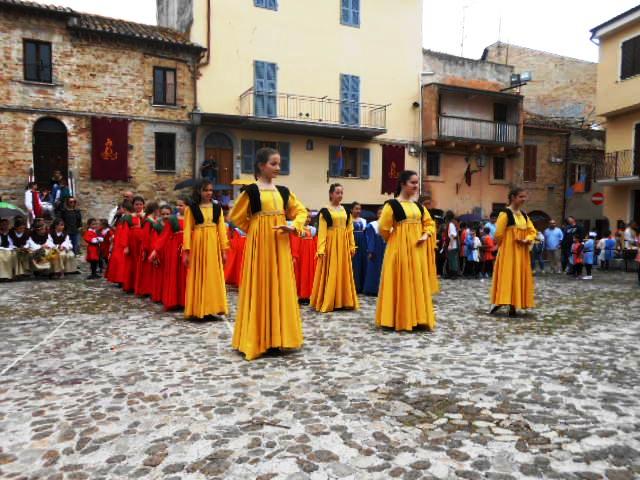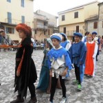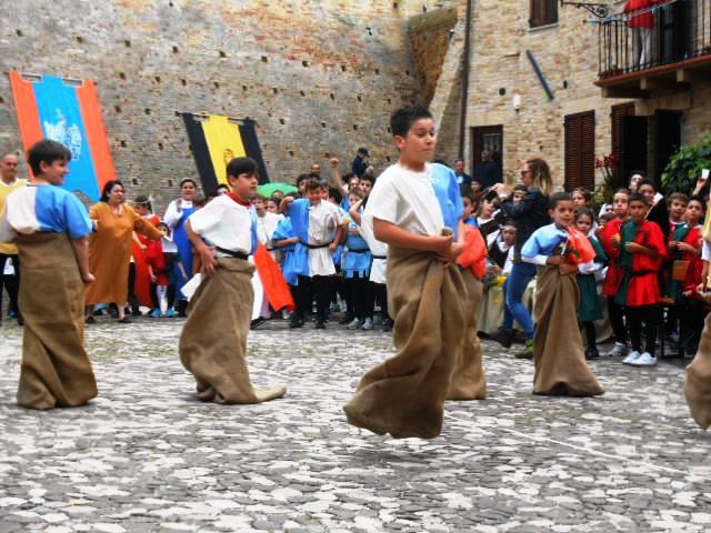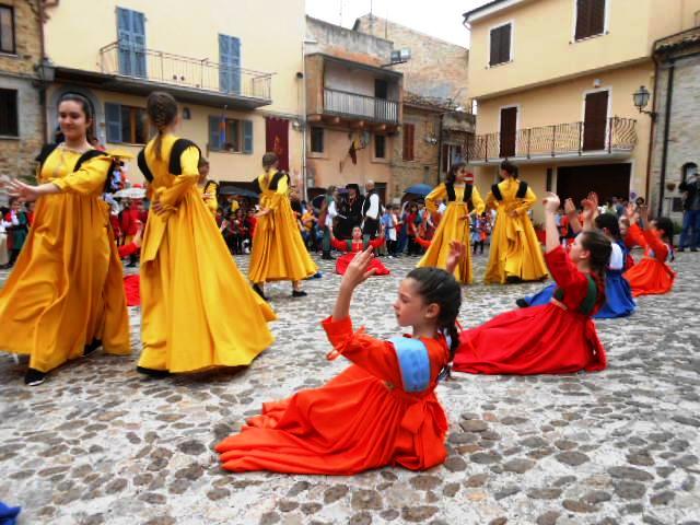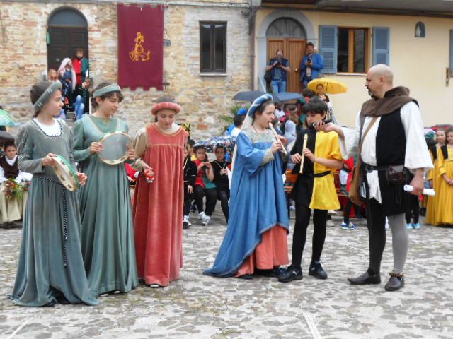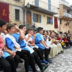 ACQUAVIVA PICENA – Sabato 31 maggio si è tenuta in piazza del Forte il Palio dei Bambini animato dagli scolari delle classi IV e V di Monsampolo del T. e di tutte le classi di Acquaviva Picena. Piazza del Forte si è riempita dei colori dei costumi dei bambini e dei 4 rioni del Palio: giallo e nero per il rione Civetta, arancione e celeste per il rione Aquila, verde e rosso per il rione Falco e bianco e celeste per il rione Picchio, quest’ultimo rappresentato dalla scuola di Monsampolo del Tronto che rappresentava anche il Gruppo dei Brunforte con Mattioli Alessio nei panni di Rinaldo dei Brunforte, Traini Denni nei panni del Duca Bonconte dei Brunforte, Impiccini Asia nei panni della Duchessa Maria dei Brunforte e Malavolta Andrea nei panni del Notaio dei Brunforte; mentre il gruppo degli Acquaviva è stato rappresentato dalla scuola di Acquaviva Picena, con Zomparelli Annalisa nei panni di Forasteria, Ciotti Mariano nei panni del Duca Rinaldo degli Acquaviva, Troiani Chiara nei panni della Duchessa Elena degli Acquaviva e Zappasodi Andrea nei panni del Notaio degli Acquaviva.