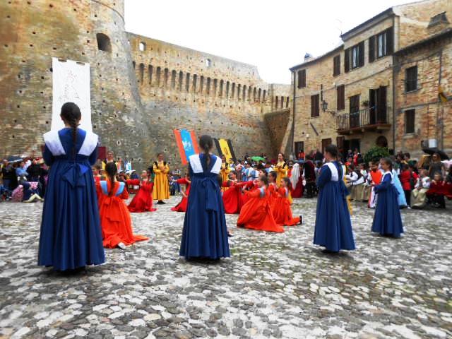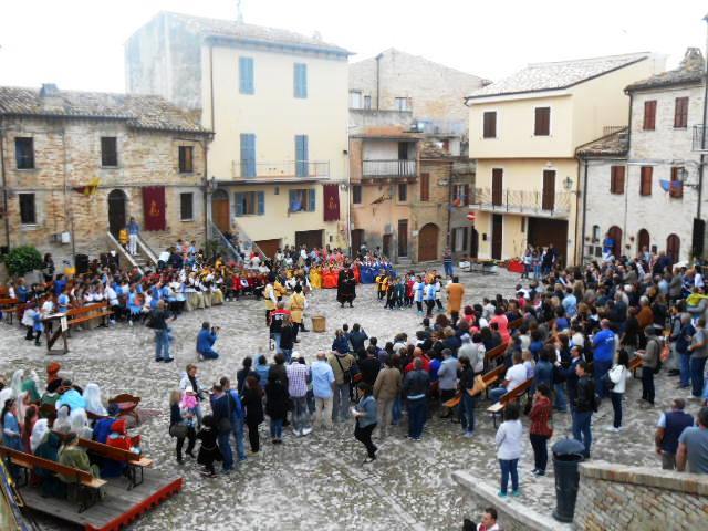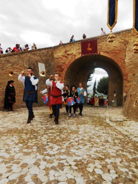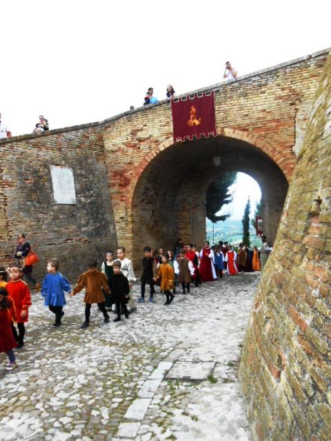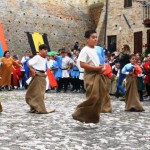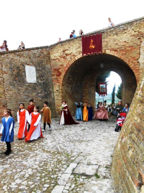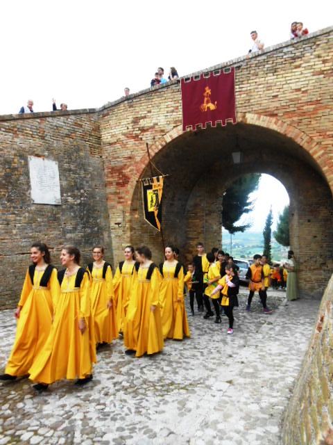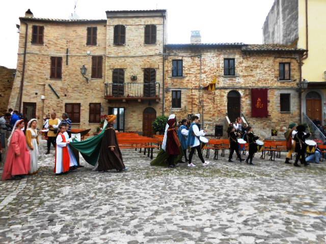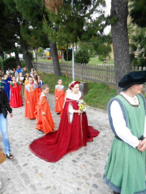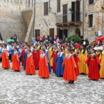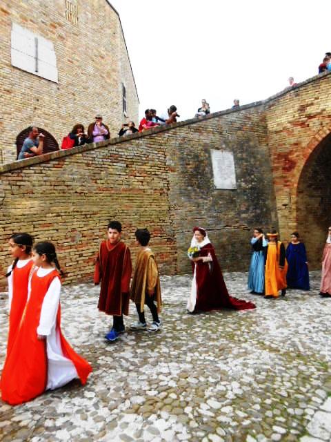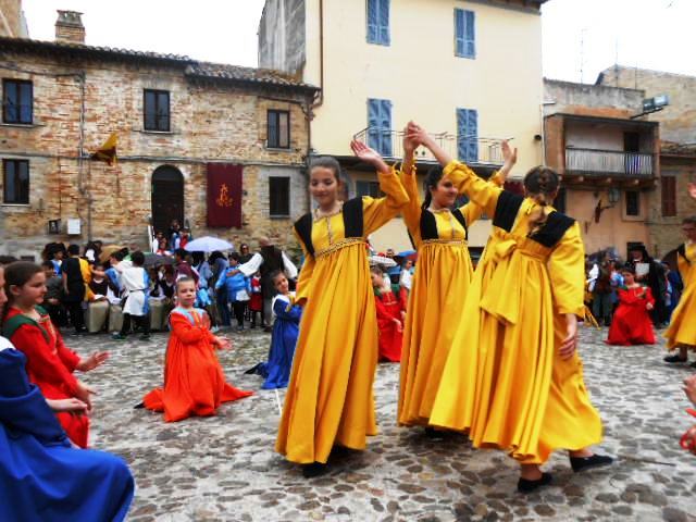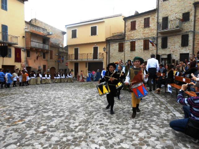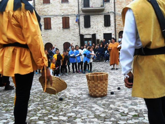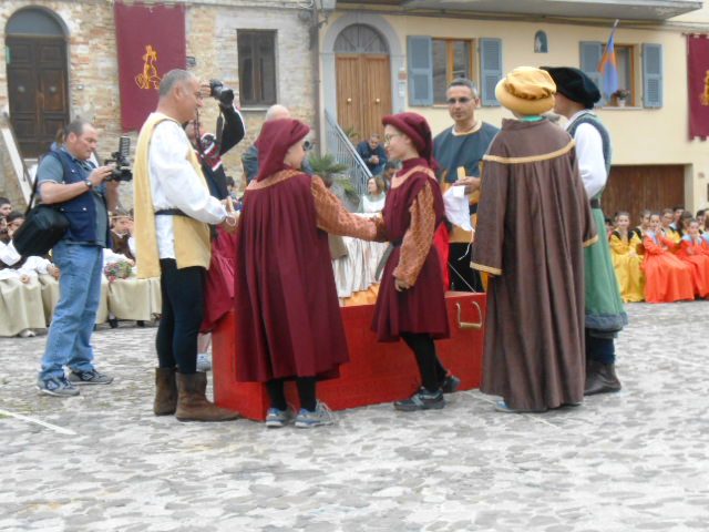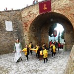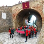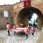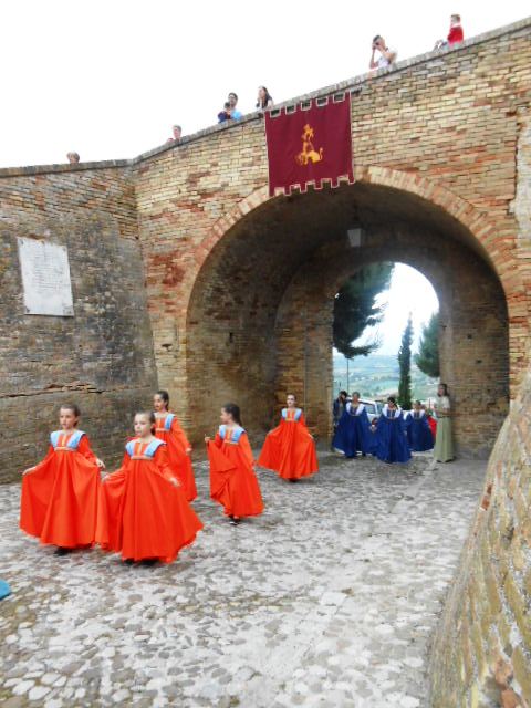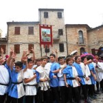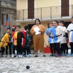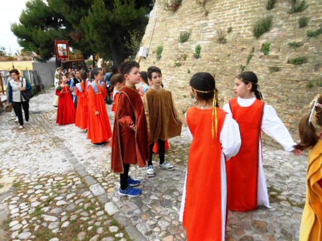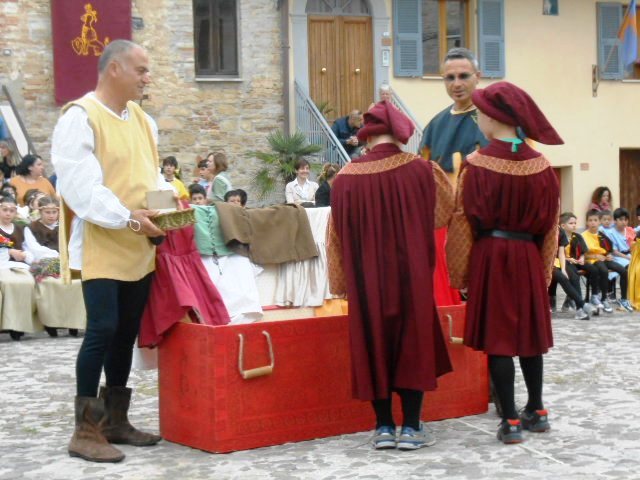 ACQUAVIVA PICENA – Sabato 31 maggio si è tenuta in piazza del Forte il Palio dei Bambini animato dagli scolari delle classi IV e V di Monsampolo del T. e di tutte le classi di Acquaviva Picena. Piazza del Forte si è riempita dei colori dei costumi dei bambini e dei 4 rioni del Palio: giallo e nero per il rione Civetta, arancione e celeste per il rione Aquila, verde e rosso per il rione Falco e bianco e celeste per il rione Picchio, quest’ultimo rappresentato dalla scuola di Monsampolo del Tronto che rappresentava anche il Gruppo dei Brunforte con Mattioli Alessio nei panni di Rinaldo dei Brunforte, Traini Denni nei panni del Duca Bonconte dei Brunforte, Impiccini Asia nei panni della Duchessa Maria dei Brunforte e Malavolta Andrea nei panni del Notaio dei Brunforte; mentre il gruppo degli Acquaviva è stato rappresentato dalla scuola di Acquaviva Picena, con Zomparelli Annalisa nei panni di Forasteria, Ciotti Mariano nei panni del Duca Rinaldo degli Acquaviva, Troiani Chiara nei panni della Duchessa Elena degli Acquaviva e Zappasodi Andrea nei panni del Notaio degli Acquaviva.