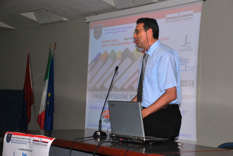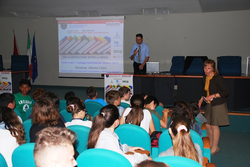 Relatore del convegno è stato il Prof. Alberto Felici, Direttore del Master UNICAM in “Gestione della Fascia Costiera e Risorse Acquatiche” il quale, riportando i risultati di specifici studi eseguiti sul pescato locale, ha introdotto i partecipanti nel mondo della qualità e sicurezza dei prodotti ittici destinati all’alimentazione umana e li ha guidati in un viaggio dentro le molecole che compongono il corpo umano ed il loro rapporto con le varie tipologie di alimenti; alla fine del di questo percorso gli studenti hanno potuto dare il giusto valore ai nostri prodotti ittici e comprendere i benefici che essi possono portare nell’ ambito di una corretta alimentazione.
