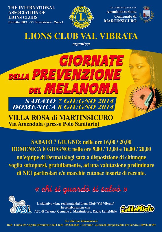 MARTINSICURO – I prossimi sabato 7 e domenica 8 giugno, nei locali del Polo Sanitario di via Amendola a Villa Rosa di Martinsicuro, il Lions Club Val Vibrata torna con uno dei suoi service più apprezzati: la Prevenzione al Melanoma.