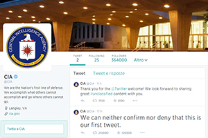 “Rapportarsi con il pubblico” e “fornire informazioni su missioni, storia e altri sviluppi”; forse anche mettere a disposizione “fascicoli desecretati”. Sono questi gli intenti dichiarati dalla Cia, Central Intelligence Agency, con il suo sbarco sui social network: è del 6 giugno il tweet d’esordio, carico di simpatica ironia (“Non possiamo confermare né negare che questo sia il nostro primo tweet”), che va ad aggiungersi alla recente pagina Facebook. Non manca l’ormai collaudato sito internet all’indirizzo www.cia.gov. Gli 007 statunitensi che si occupano della sicurezza a livello mondiale si prefiggono inoltre d’informare i cittadini sugli annunci di lavoro presso l’istituzione federale e di condividere “riflessioni sulla storia dell’intelligence”.
