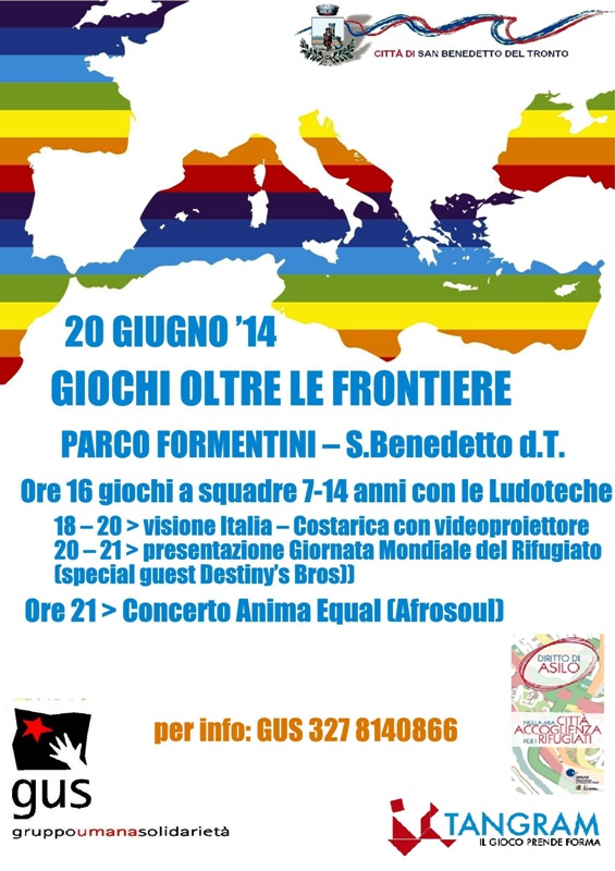 SAN BENEDETTO DEL TRONTO – In occasione della Giornata Mondiale del Rifugiato, istituita con la risoluzione n°55/76 dell’Assemblea Generale delle Nazioni Unite, venerdì 20 giugno, nel parco di via Formentini, l’associazione “G.U.S. – Gruppo Umana Solidarietà – Guido Puletti” in collaborazione con le ludoteche comunali e la cooperativa “Tangram”, il patrocinio dell’Amministrazione comunale e il contributo dell’associazione “Cittadini Insieme” che gestisce l’area verde, si terrà la manifestazione “Giochi oltre le frontiere” aperta alla cittadinanza e dedicata al tema dei rifugiati.