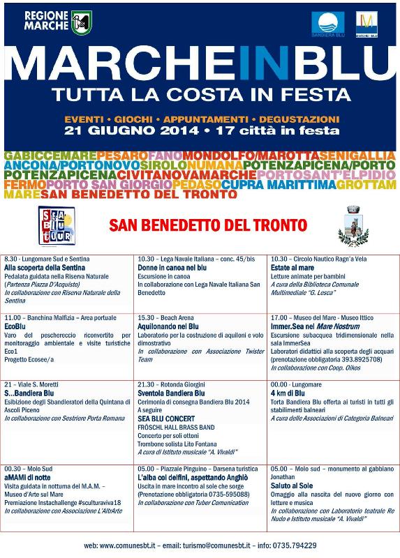 Gli eventi si snoderanno lungo tutto il litorale e interesseranno i Comuni insigniti del prestigioso riconoscimento della F.E.E. (Foundation for Environmental Education – Italia): nella provincia di Ancona, Senigallia, Sirolo, Numana e Portonovo-Ancona; nella provincia di Ascoli Piceno, San Benedetto del Tronto, Cupra Marittima e Grottammare; nella Provincia di Fermo, Pedaso, Fermo-Lido, Porto Sant’Elpidio e Porto San Giorgio; nella Provincia di Macerata, Potenza Picena-Porto Potenza Picena e Civitanova Marche; nella Provincia di Pesaro e Urbino, Mondolfo-Marotta, Pesaro, Fano e Gabicce Mare.