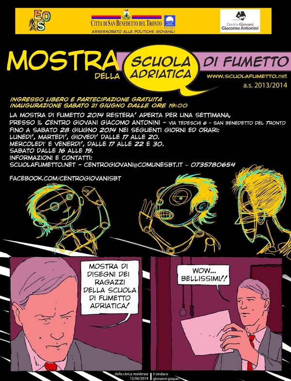 SAN BENEDETTO DEL TRONTO – Si inaugura sabato 21 giugno alle 19, nella sala multimediale PrimoPiano del “CentroGiovani Giacomo Antonini” di via Tedeschi a San Benedetto del Tronto, la mostra organizzata dal CentroGiovani, dalla Scuola di Fumetto Adriatica in collaborazione con Eos Cooperativa Sociale e patrocinata dall’Amministrazione comunale.