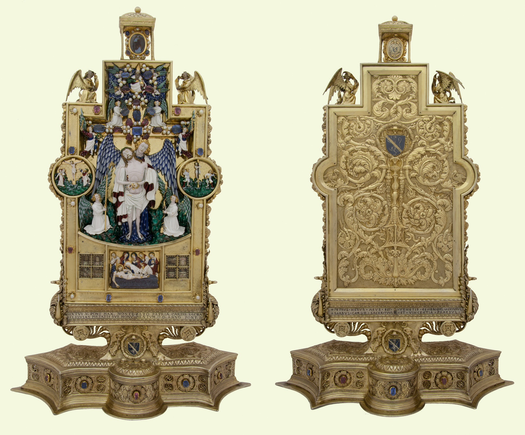 Nel 1587 Papa Sisto V donò il Reliquiario alla città di Montalto. Nell’occasione capovolse due delle tre iscrizioni di Pietro Barbo e fece apporre la propria dedica alla “sua patria carissima”; modificò poi gli stemmi dell’antico possessore aggiungendovi i propri emblemi: la stella e tre monti. Quindi dotò il manufatto di 8 reliquie disposte in teche affiancate alla scena della Deposizione nel sepolcro.