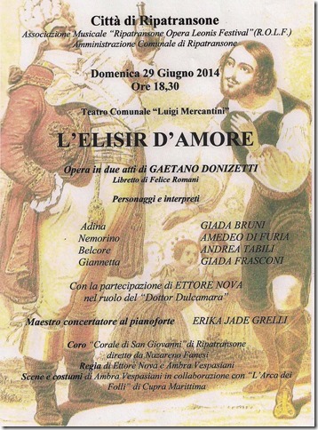 RIPATRANSONE – Domenica 29 Giugno ore 18:30, presso il Teatro Storico Comunale Luigi Mercantini andrà in scena, l’opera in due atti di Gaetano Donizetti, l’Elisir d’amore.