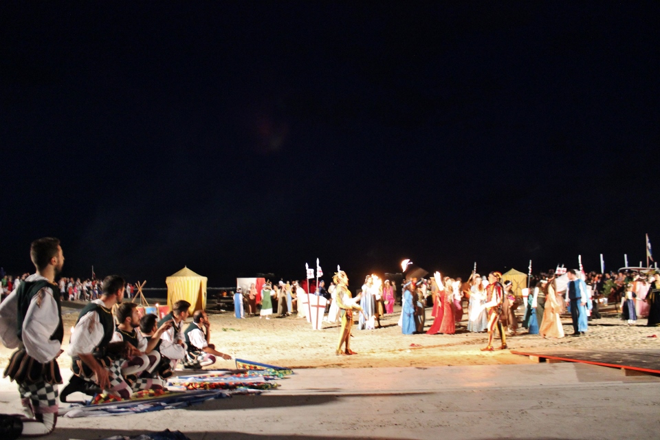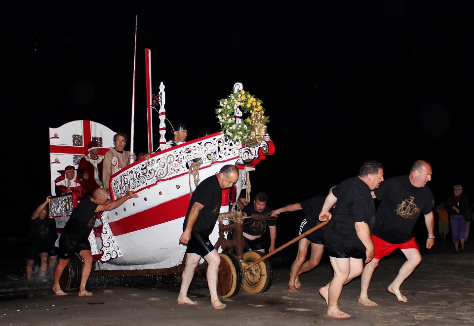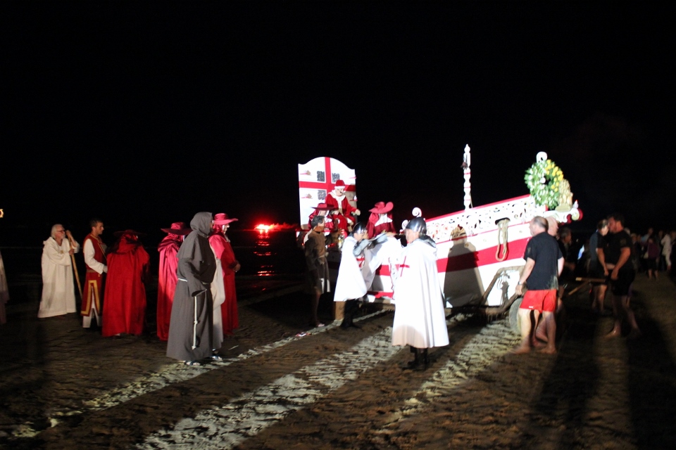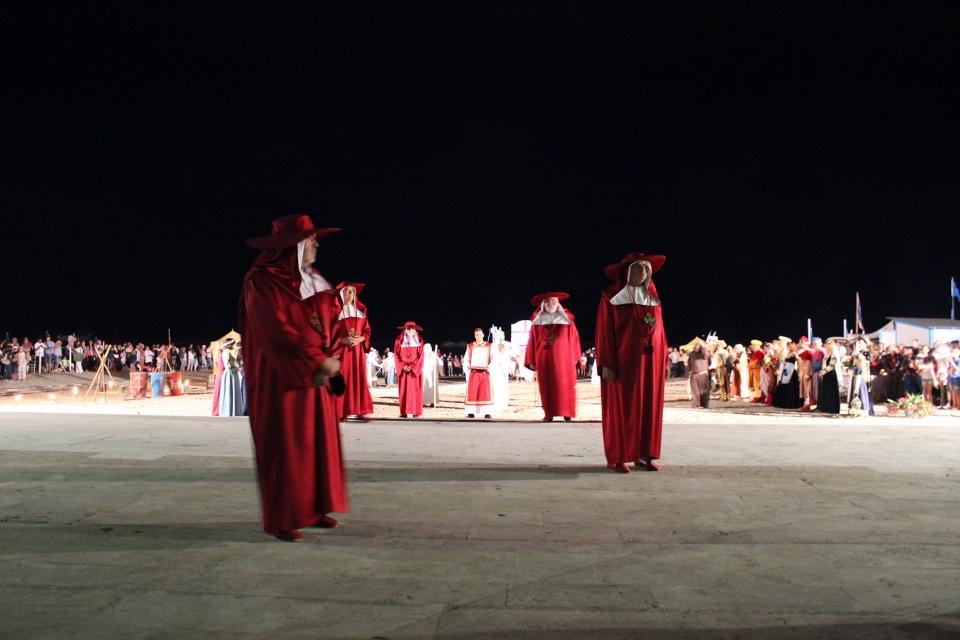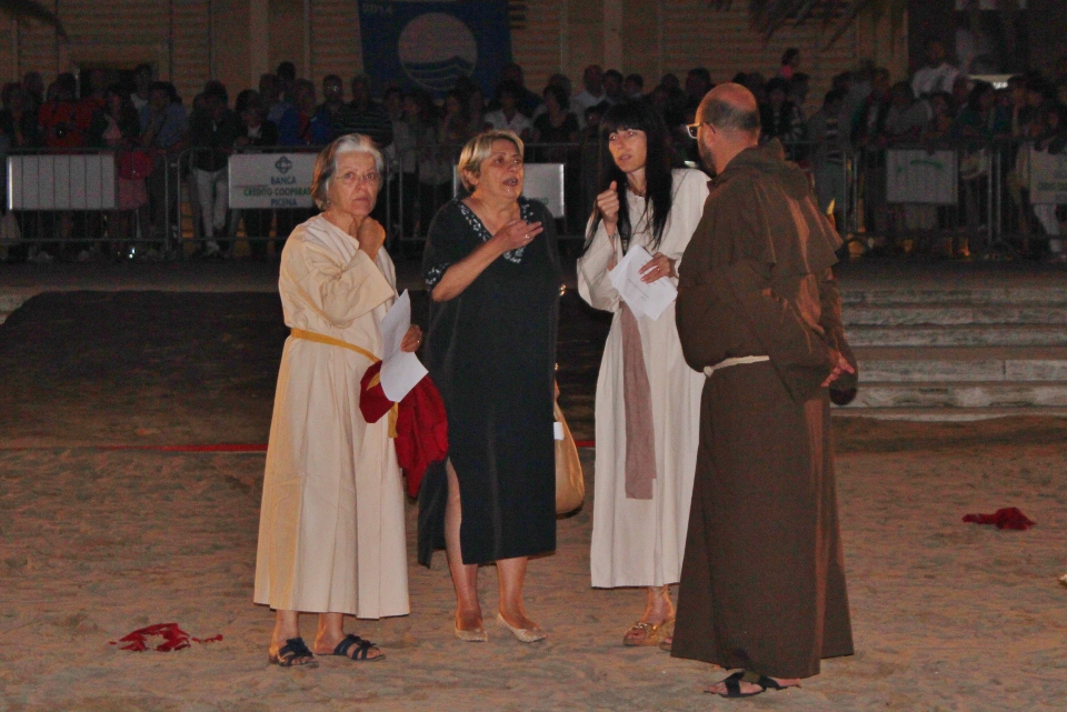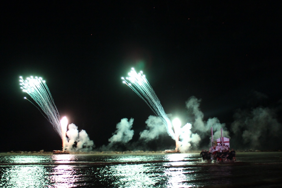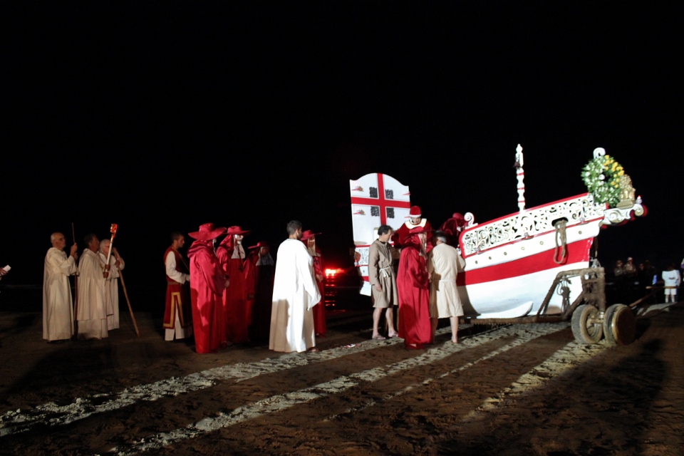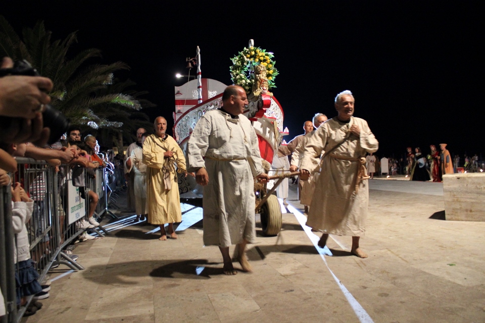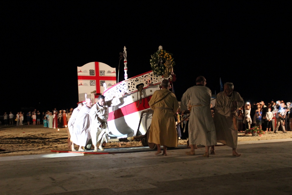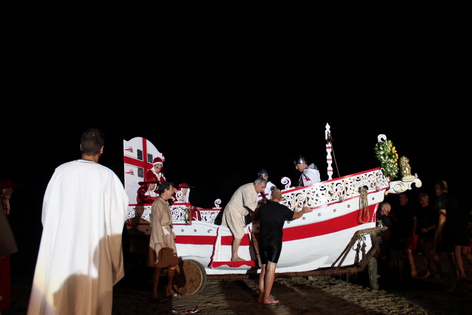 All’imbrunire, già la folla si era radunata sulla spiaggia, poi la pirotecnica “Santa Chiara” ha iniziato a far brillare i fuochi d’artificio per simulare una tempesta e la “cocca” dove si trovava il “papa” ha iniziato ad avvicinarsi fino ad arrivare sulla riva.
