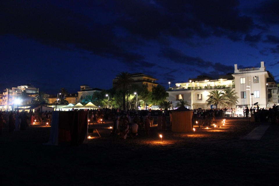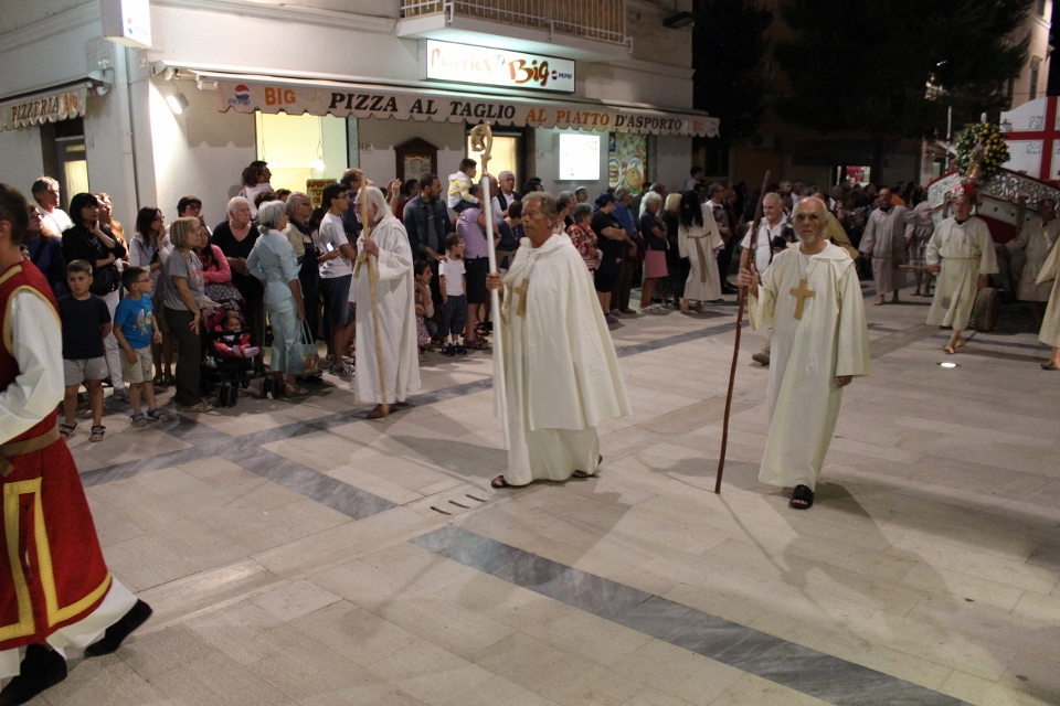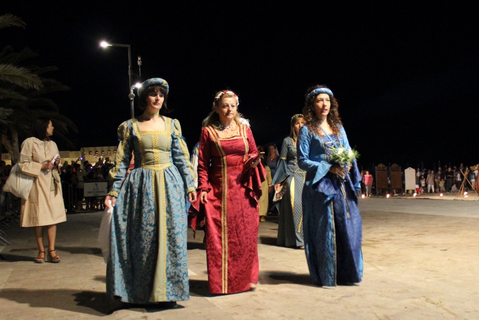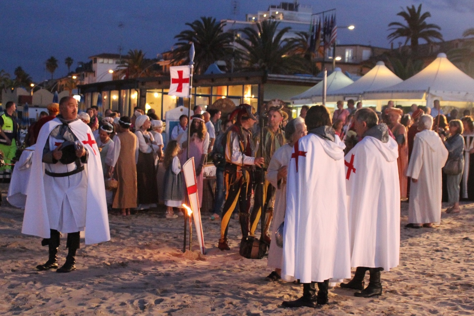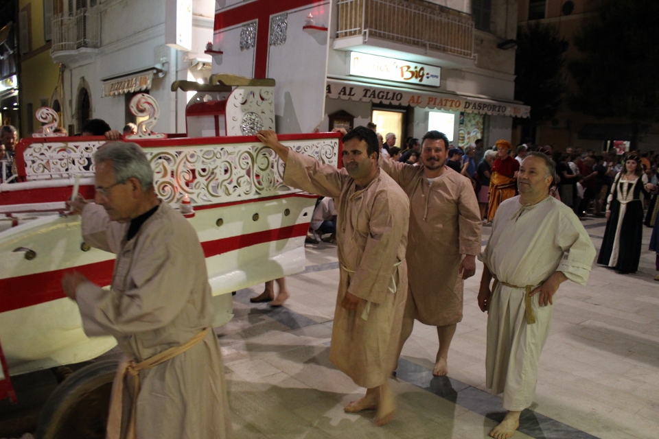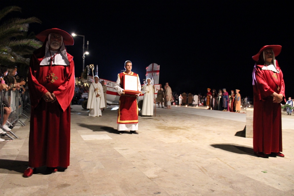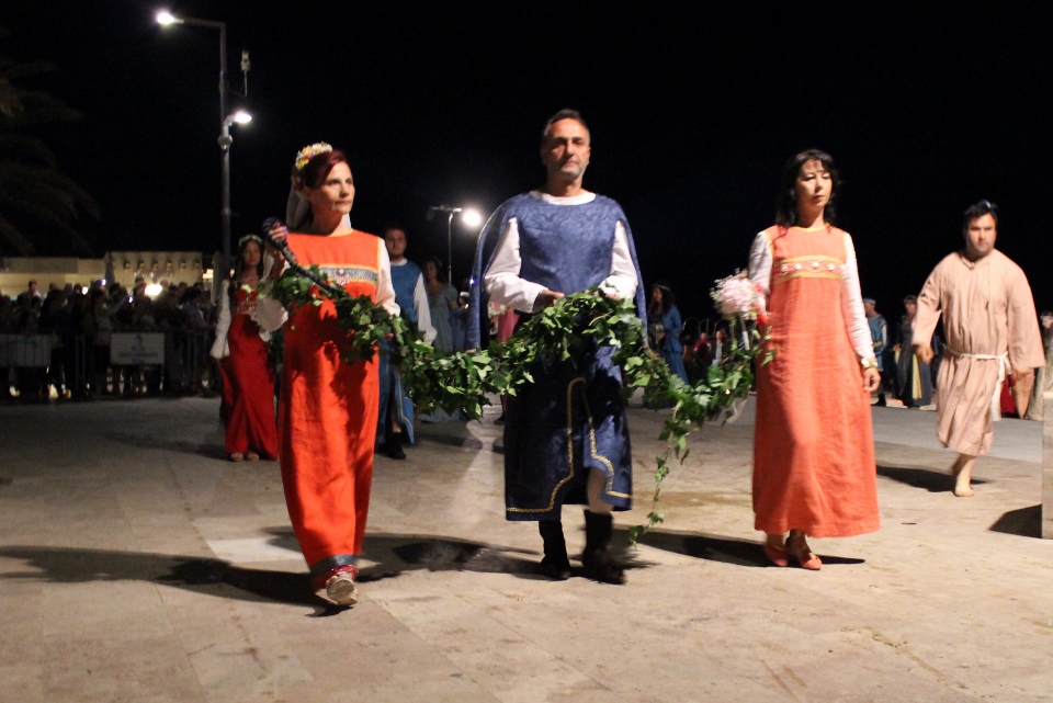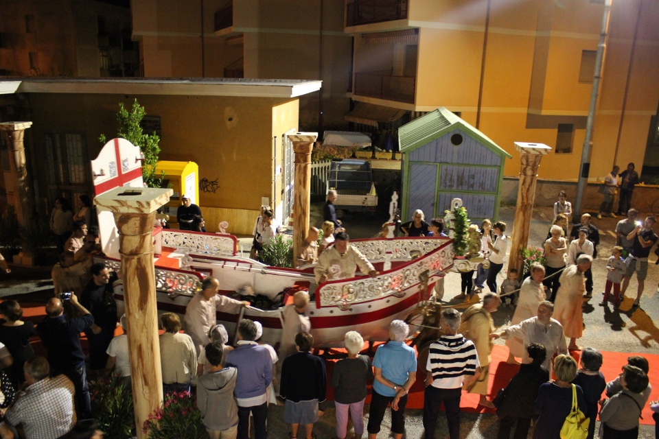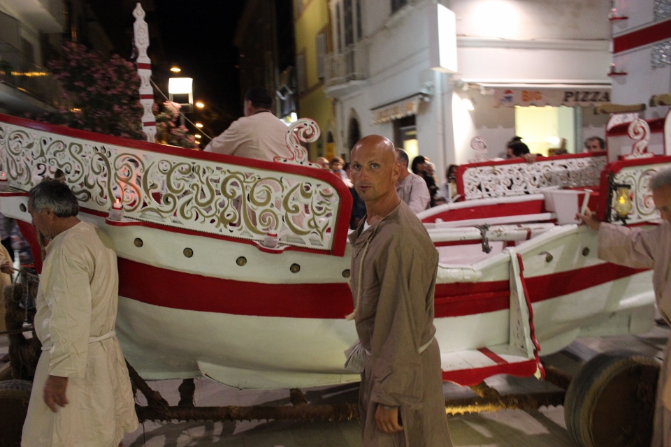 All’imbrunire, già la folla si era radunata sulla spiaggia, poi la pirotecnica “Santa Chiara” ha iniziato a far brillare i fuochi d’artificio per simulare una tempesta e la “cocca” dove si trovava il “papa” ha iniziato ad avvicinarsi fino ad arrivare sulla riva.